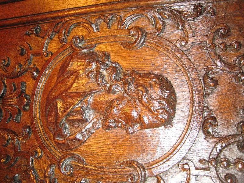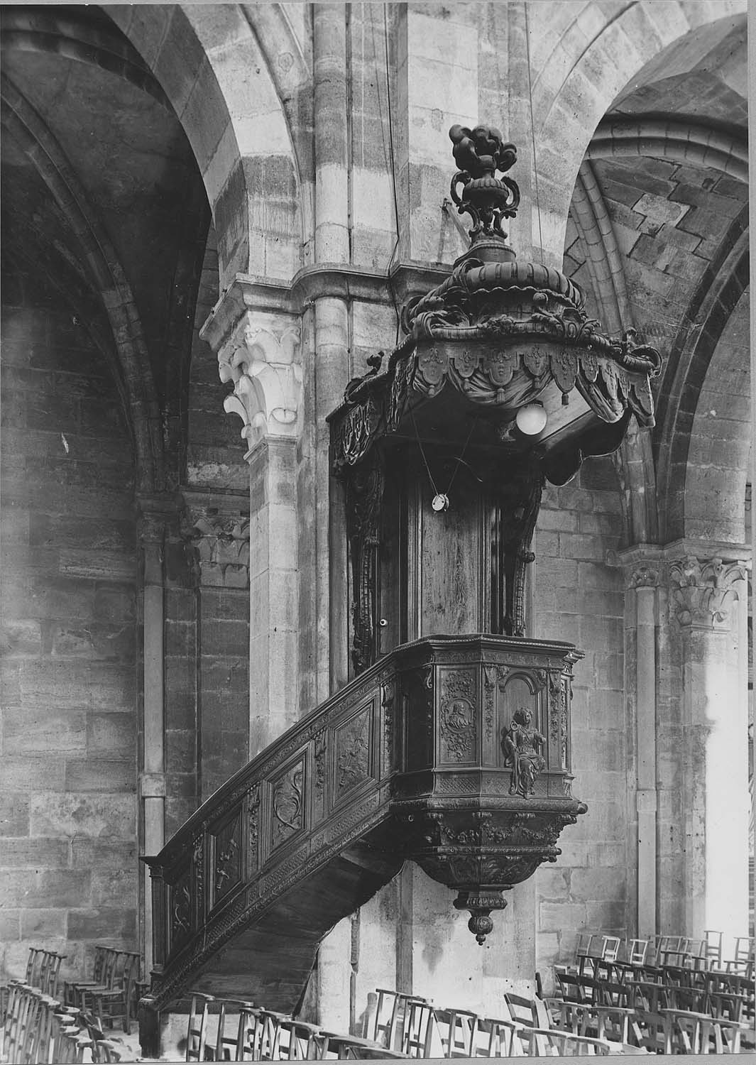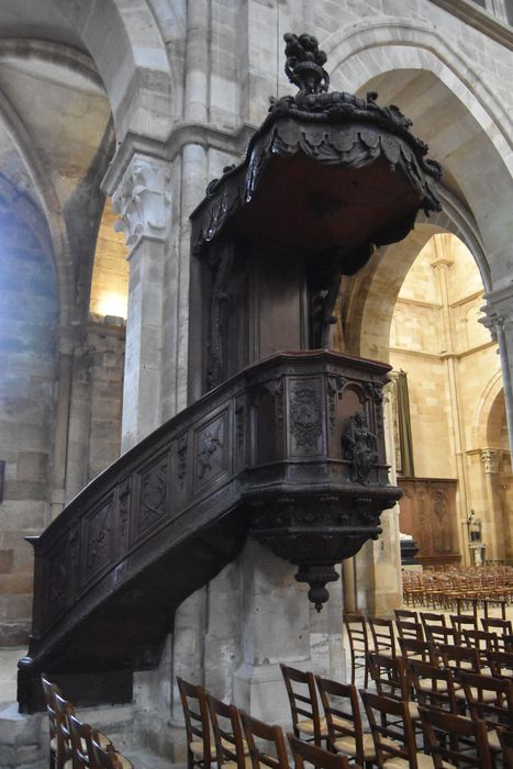 Sculptures en bois massif. Celles représentant des épées, situées sur les panneaux de l'escalier, ont été partiellement bûchées à une époque antérieure. La cuve de la chaire était ornée de trois statues. Seule celle de la façade représentant l'Espérance subsiste. Les deux autres (la Foi et la Charité) ont disparu. Les marches de l'escalier ne sont pas d'origine.