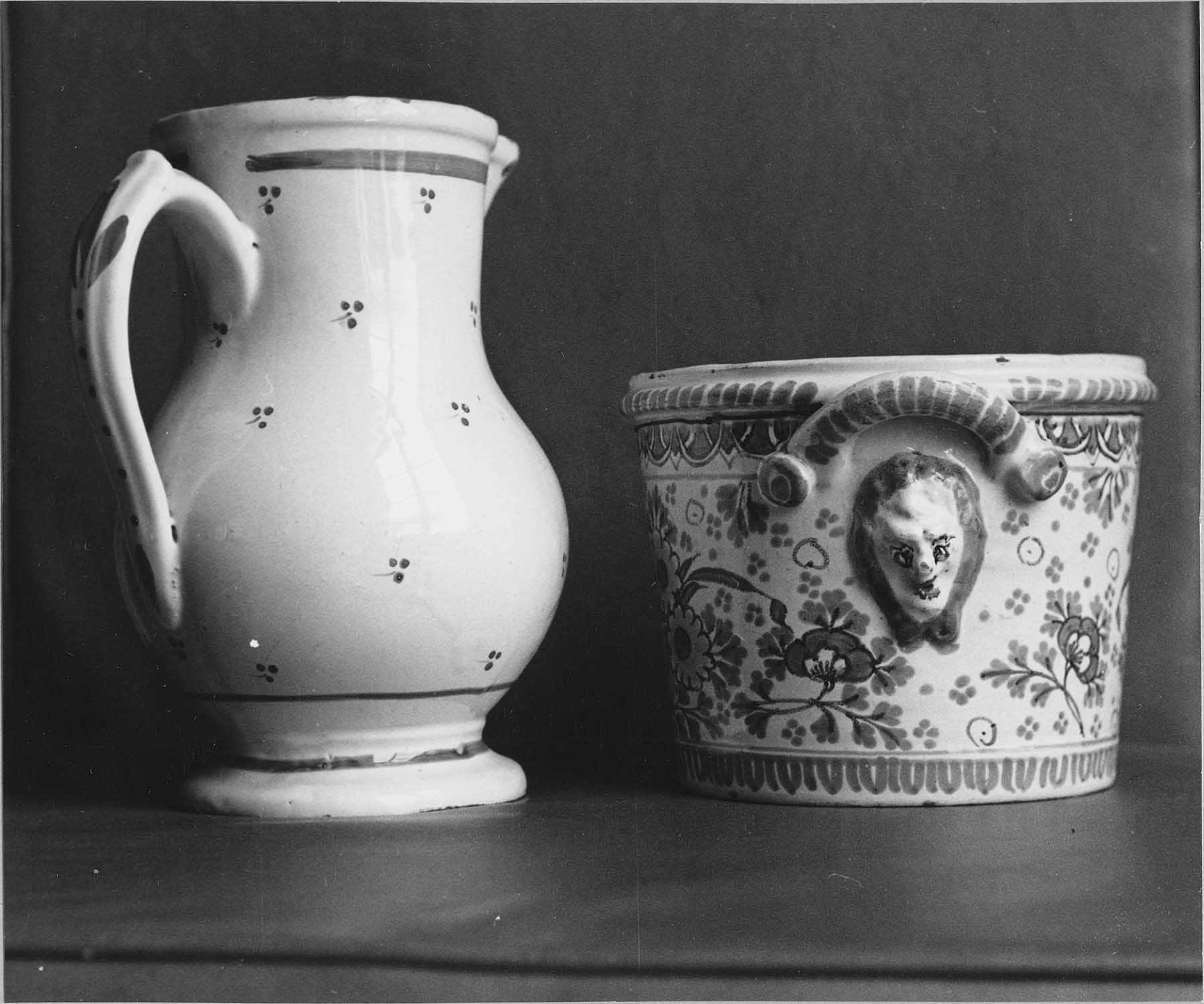 Pot à anse, semis de fleurettes bleues sur fond blanc.