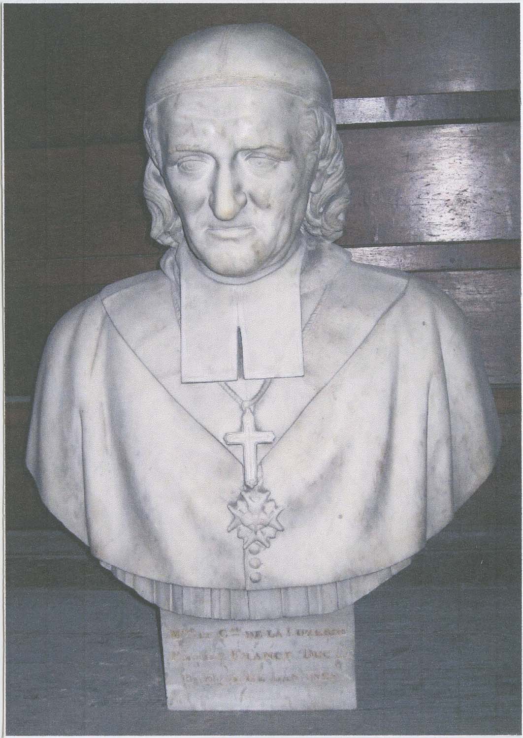 Inscriptions sur le dé supportant le buste : face, MGR LE CAL DE LA LUZERNE PAIR DE FRANCE DUC ET EVEQUE DE LANGRES, côté dextre : J. B. Maire 1822