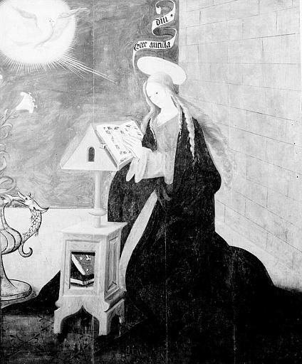 La Dormition de la Vierge, au revers la Vierge de l'Annonciation, panneaux peints. Cette peinture sur bois est sans doute le volet de droite d'un retable, dont les autres panneaux sont perdus. Sur la Dormition, la Vierge porte une robe rouge avec un crêpe noir. Le lit est recouvert d'une draperie rouge. L'ensemble comporte dix personnages et deux anges.