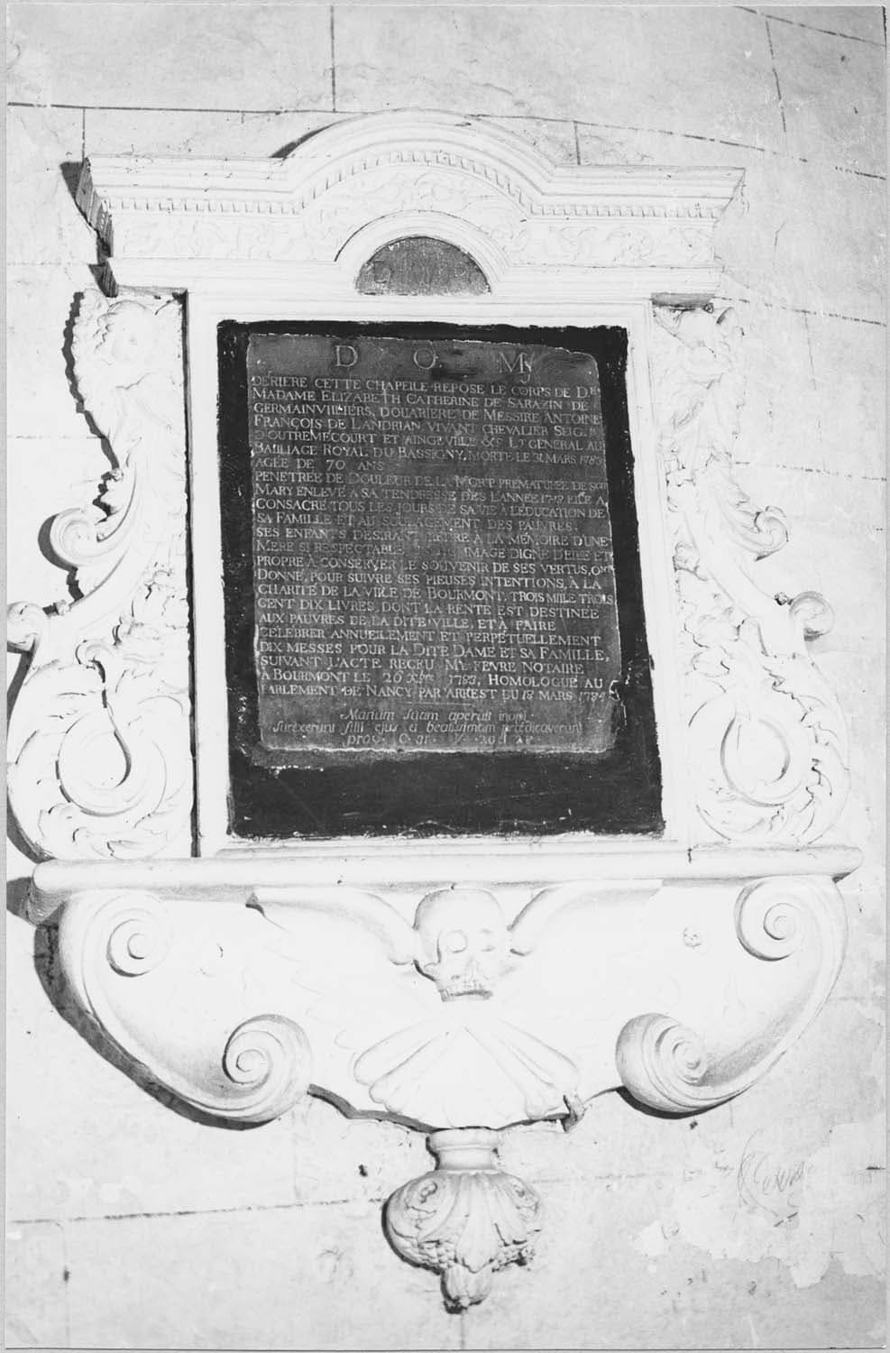 monument funéraire d'Elisabeth-Catherine de Sarrazin de Germainvilliers, douairière de Messire Antoine-François de Landrian