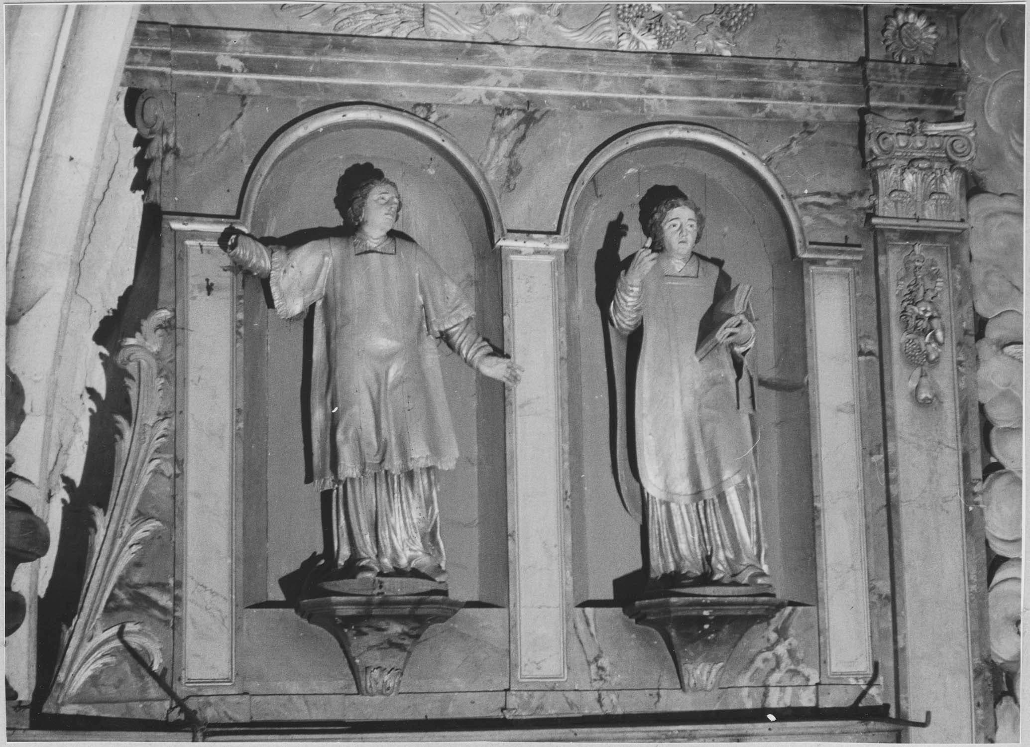 autel, tabernacle, exposition, 4 statues : Saint Evêque, Saint Laurent diacre, Saints (maître-autel)