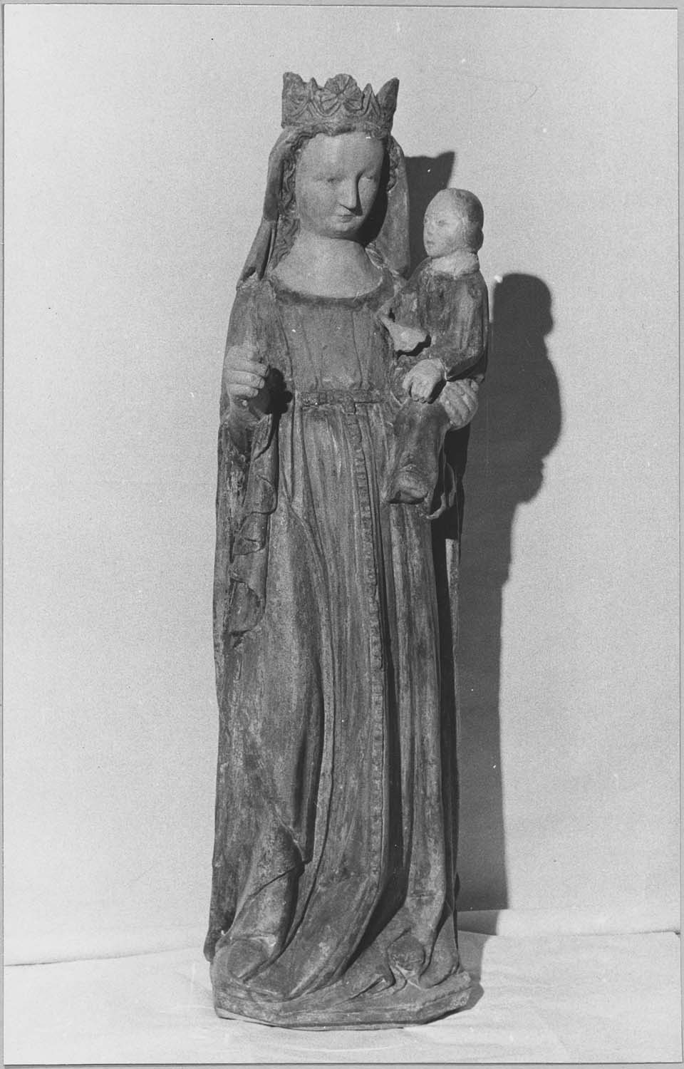 Vierge avec voile tombant sur les épaules enveloppées d'une grande robe serrée au-dessus des seins par une lanière, elle porte sur le bras gauche l'Enfant habillé et tenant une sphère de la main droite.