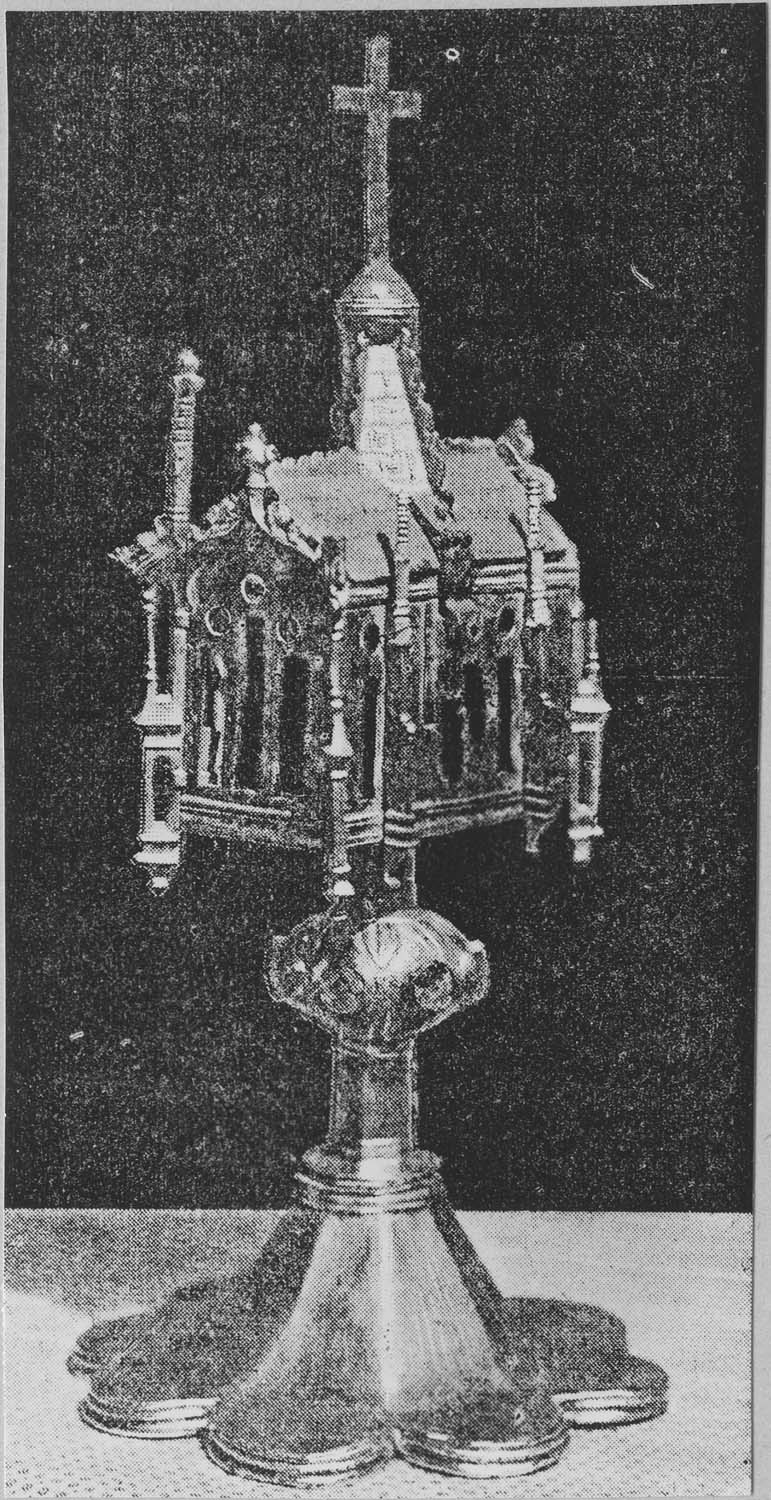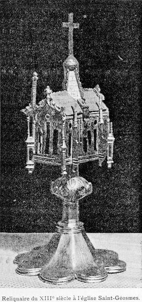 Reliquaire pédicule en forme de chapelle. Il se compose d'une châsse barlongue en forme de chapelle, au centre de laquelle se dresse un clocher amorti par une croix, et qui supporte un pied octogonal dont la tige est interrompue par un noeud portant huit boutons saillants.
