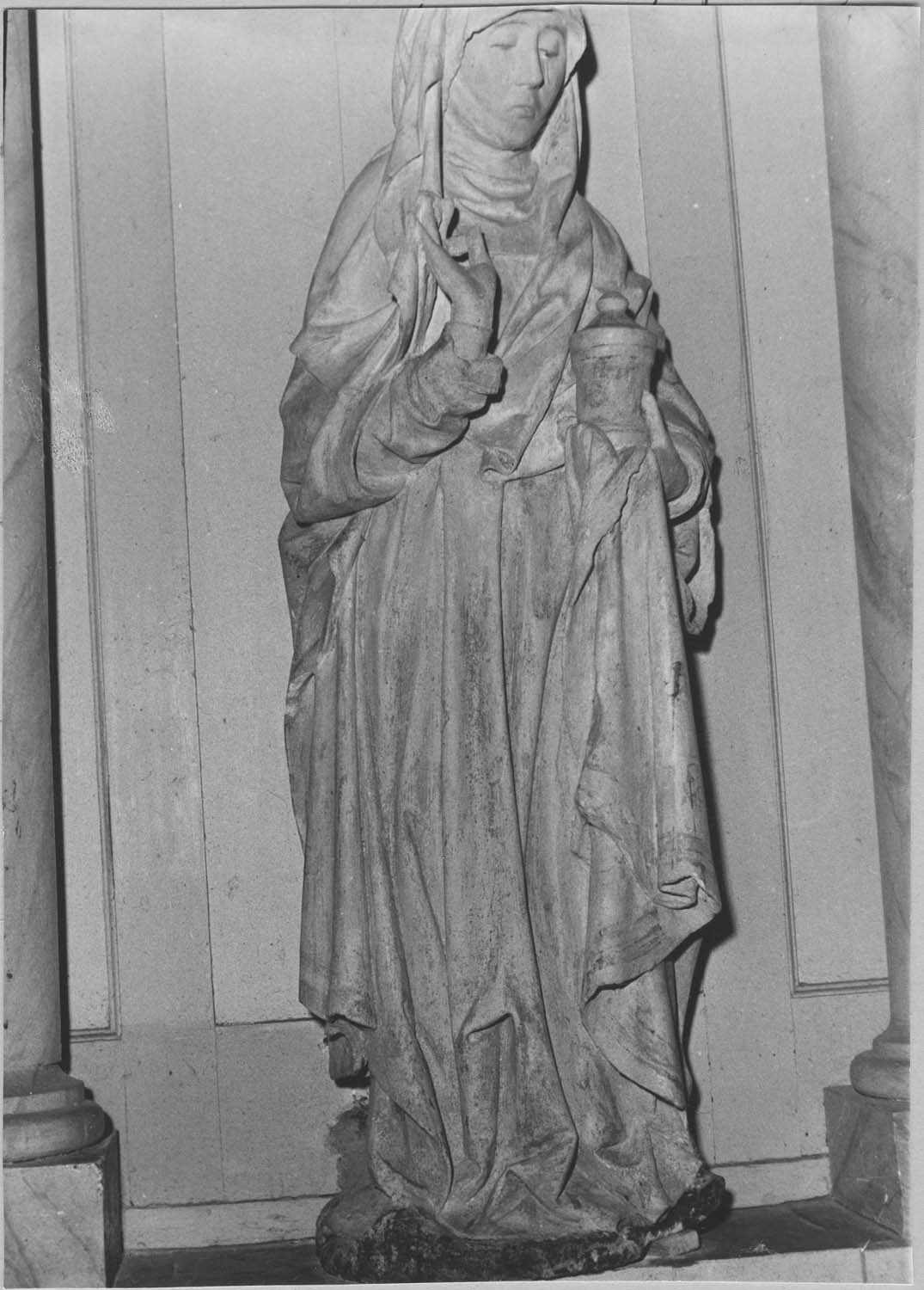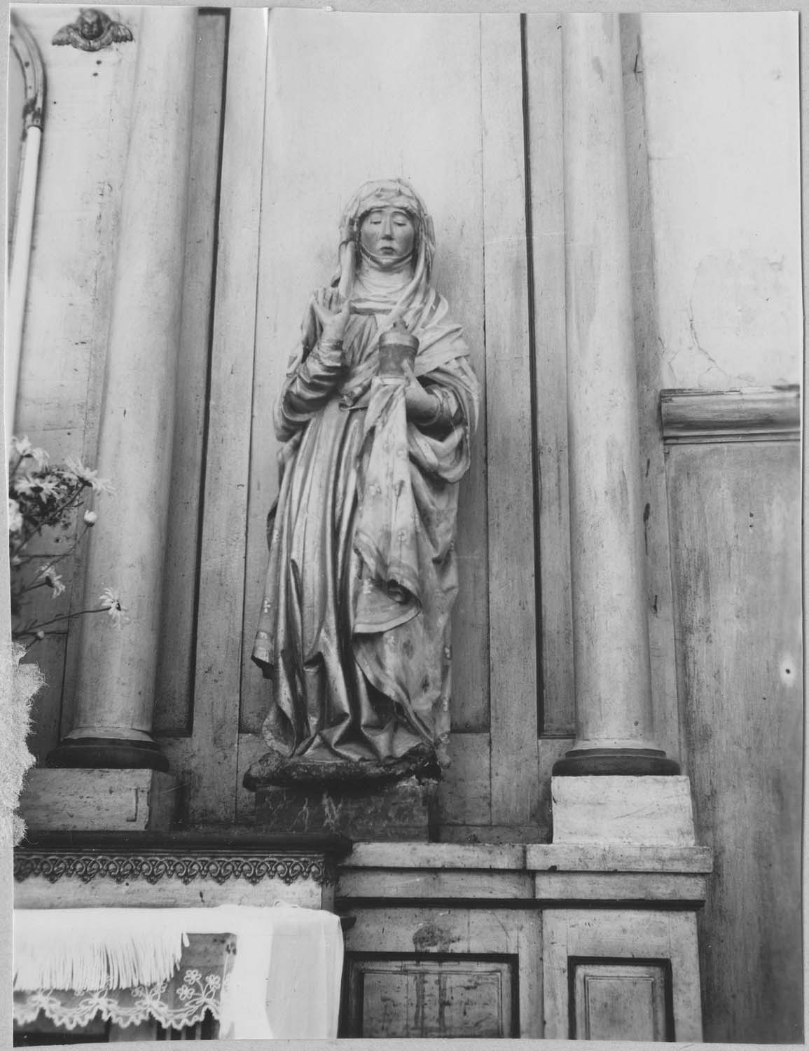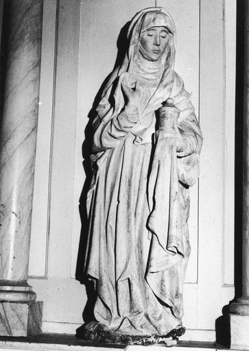 La sainte tient un vase à parfums de la main gauche. Elle lève la main droite. L'expression de la tête où les paupières sont baissées est belle.