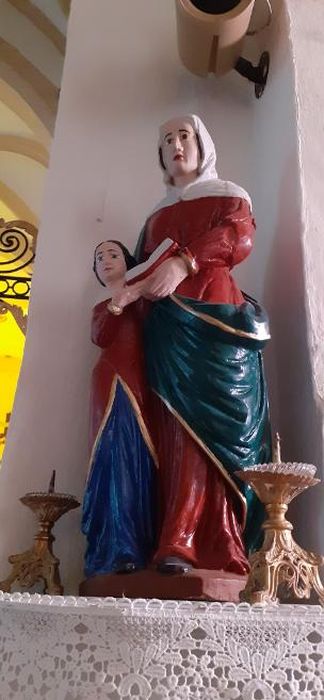 Autre titre : l'Education de la Vierge. Oeuvre médiocre d'art populaire. Sainte Anne porte une robe rouge et un manteau vert ; la Vierge une robe ocre foncé et un manteau bleu.