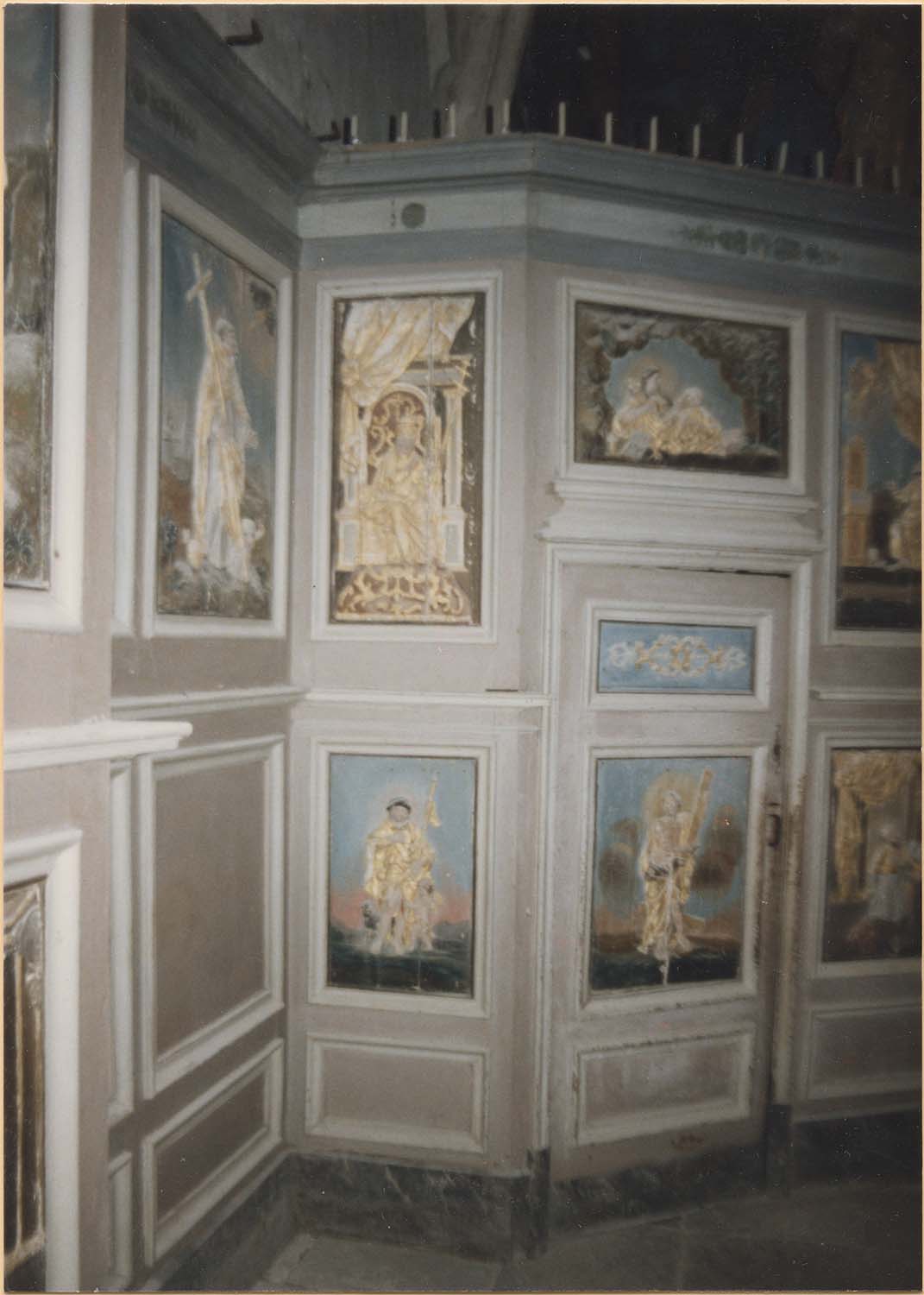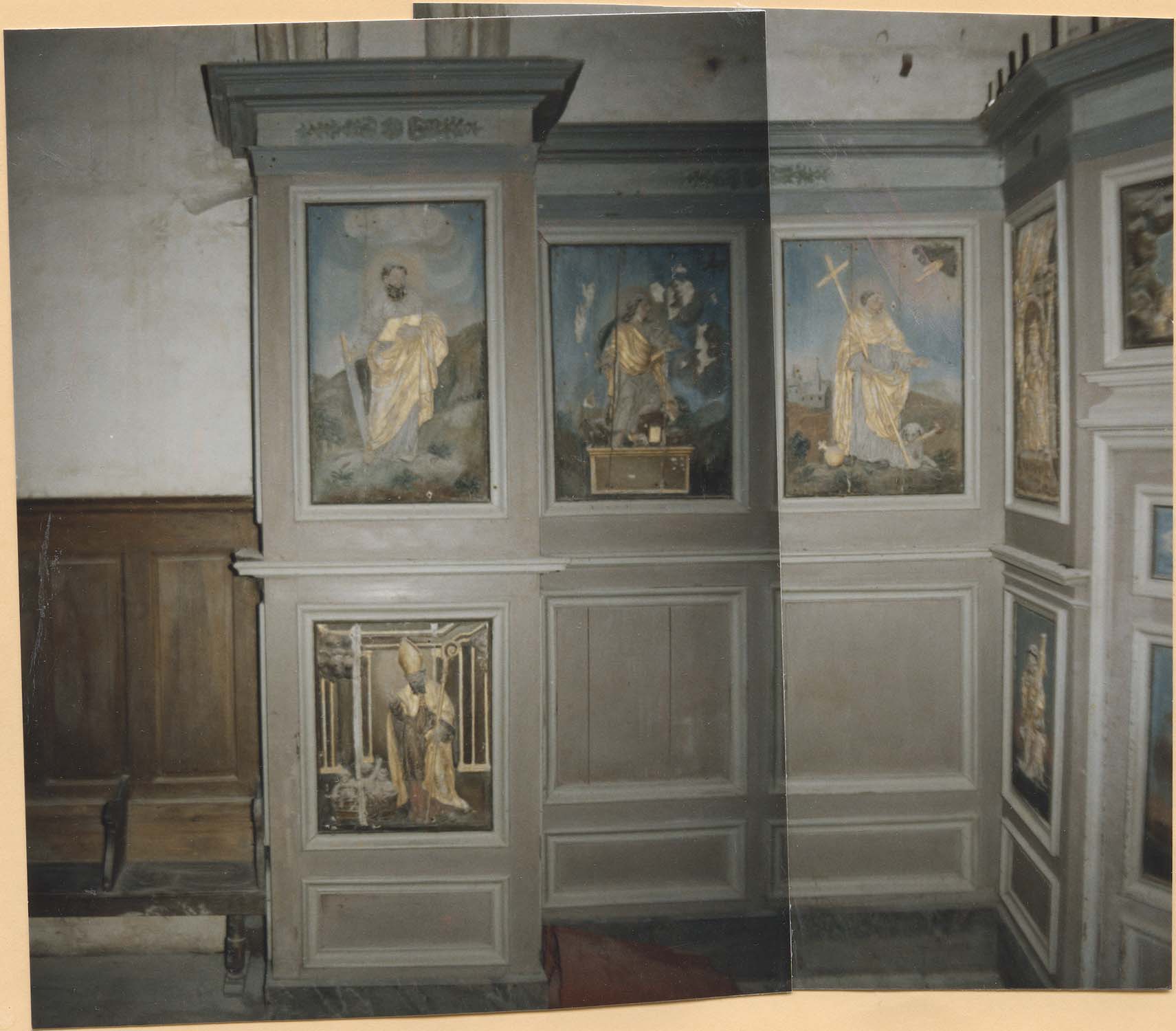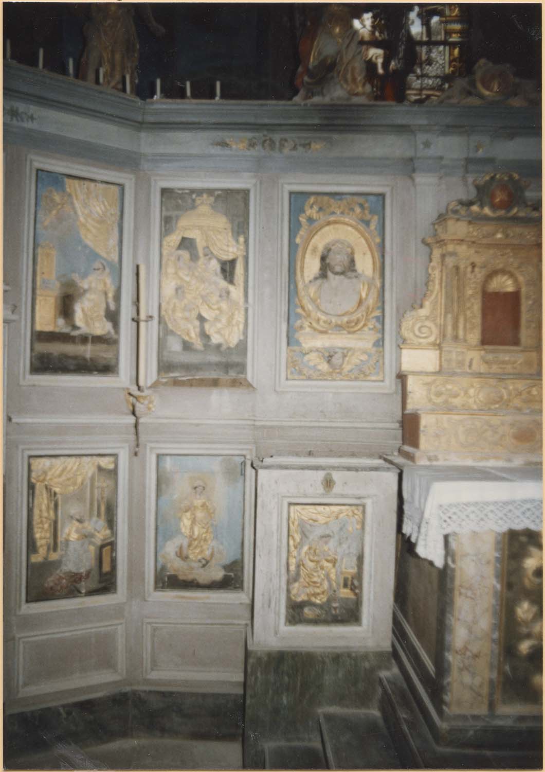 Ensemble des boiseries de l'autel. De chaque côté de l'autel, un lambris se développe et fait retour à droite et à gauche. Les angles sont coupés de biais. Dans ces biais, une porte. Deux socles encadrent l'autel et un bras cérofère subsiste à droite. Quatre anges en bois doré ont été posés symétriquement sur la corniche au-dessus du retable. Les lambris sont divisés en huit travées de chaque côté et sur trois niveaux. Les deux niveaux supérieurs de chaque travée sont décorés de panneaux sculptés en bas reliefet polychromés. Six sont nus. Les dispositions de ces panneaux semblent avoir été peu modifiées. Certains, toutefois, ont été redorés et peints à nouveau. L'ensemble constitue un véritable programme iconographique centré sur la vie de la Vierge, sur la dévotion à la Croix et sur les intercesseurs habituels. C'est un excellent témoignage des activités missionnaires de la seconde moitié du 17e siècle et de l'habileté des artisans de la région.