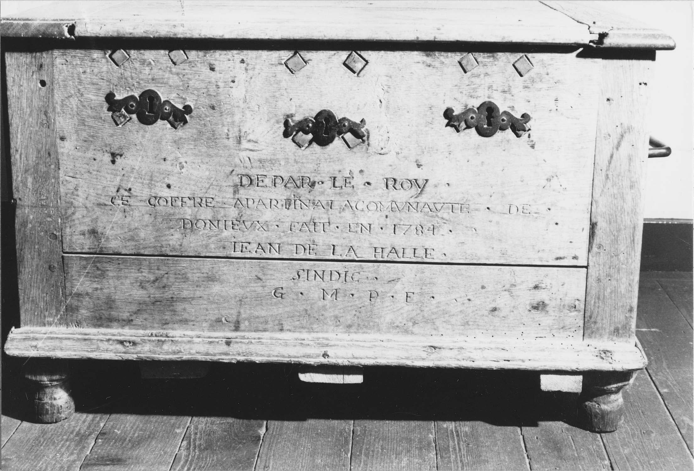 Coffre de communauté, ferrures. L'ensemble du coffre est intéressant par sa bonne conservation et surtout par toutes les inscriptions qu'il renferme.