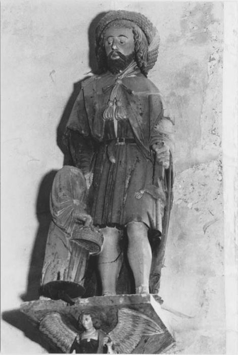Statue, Saint Joseph charpentier et l'Enfant Jésus, et sa console : ange tenant des burettes, pierre polychrome, milieu du XVIème siècle.