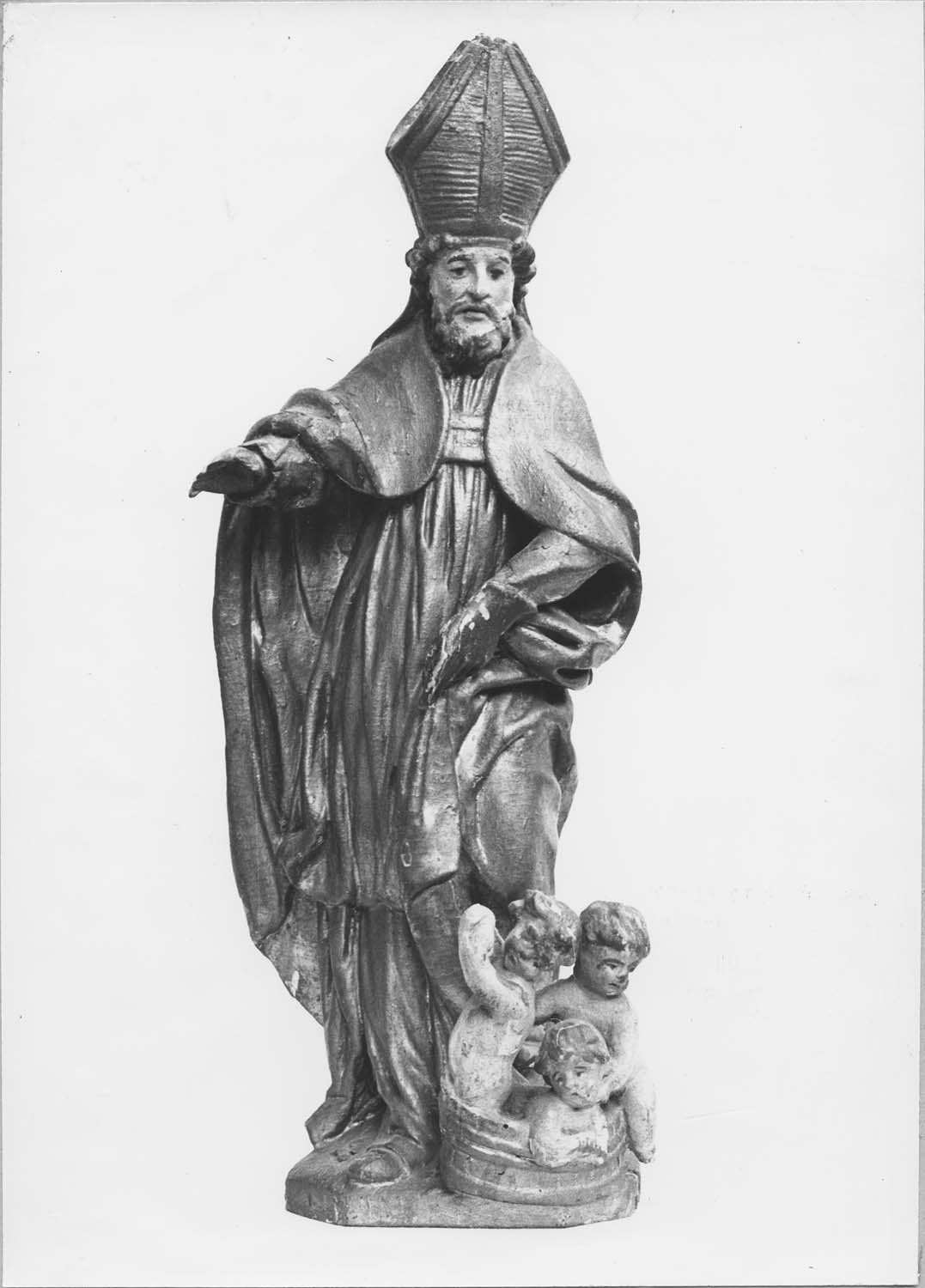 Saint Nicolas, statuette de bâton de procession, bois sculpté, peint et doré, XVIIIè s.
