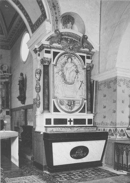 POP | Plateforme ouverte du patrimoineretable du Rosaire, bas-relief : la Vierge du Rosaire entre saint Dominique et sainte Catherine