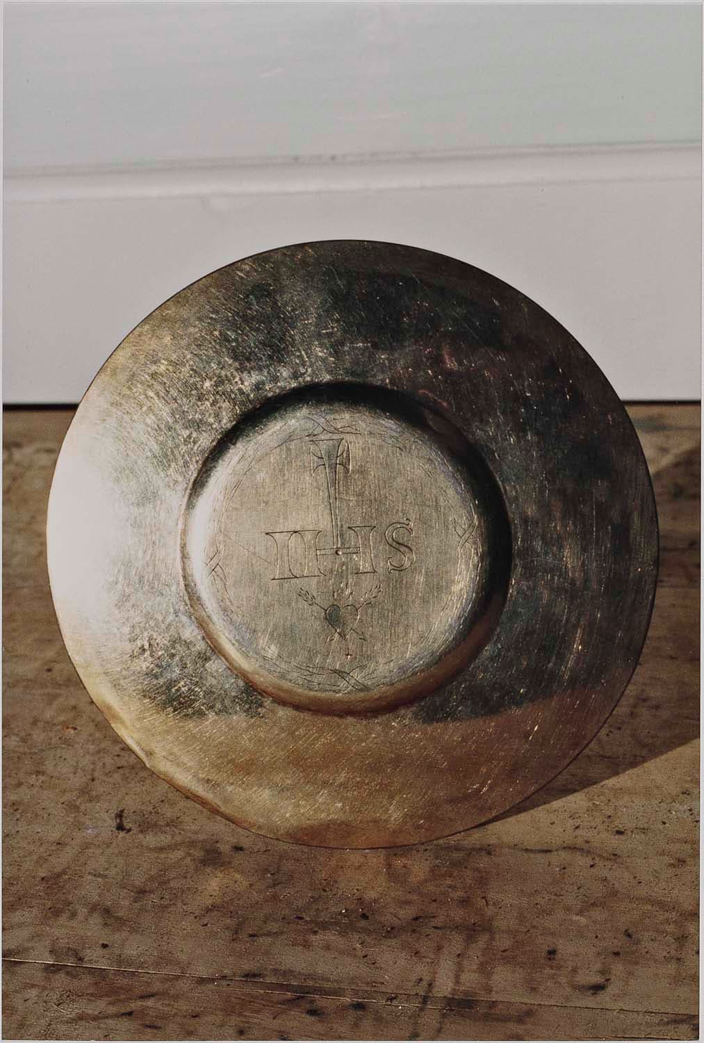 Le décor gravé représente le sigle IHS à haute croix pattée, sur coeur enflammé percé de deux flèches croisées ; le tout inscrit dans une couronne de laurier à quatre ligatures rubannées.