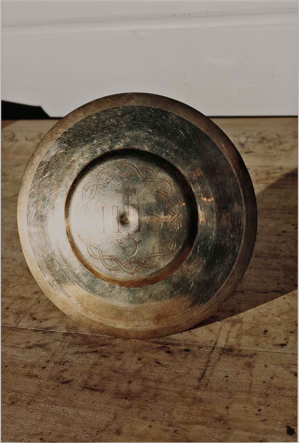 Le décor gravé représente le signe IHS avec une croix, sur coeur percé de trois clous, le tout inclus dans une couronne d'épines.