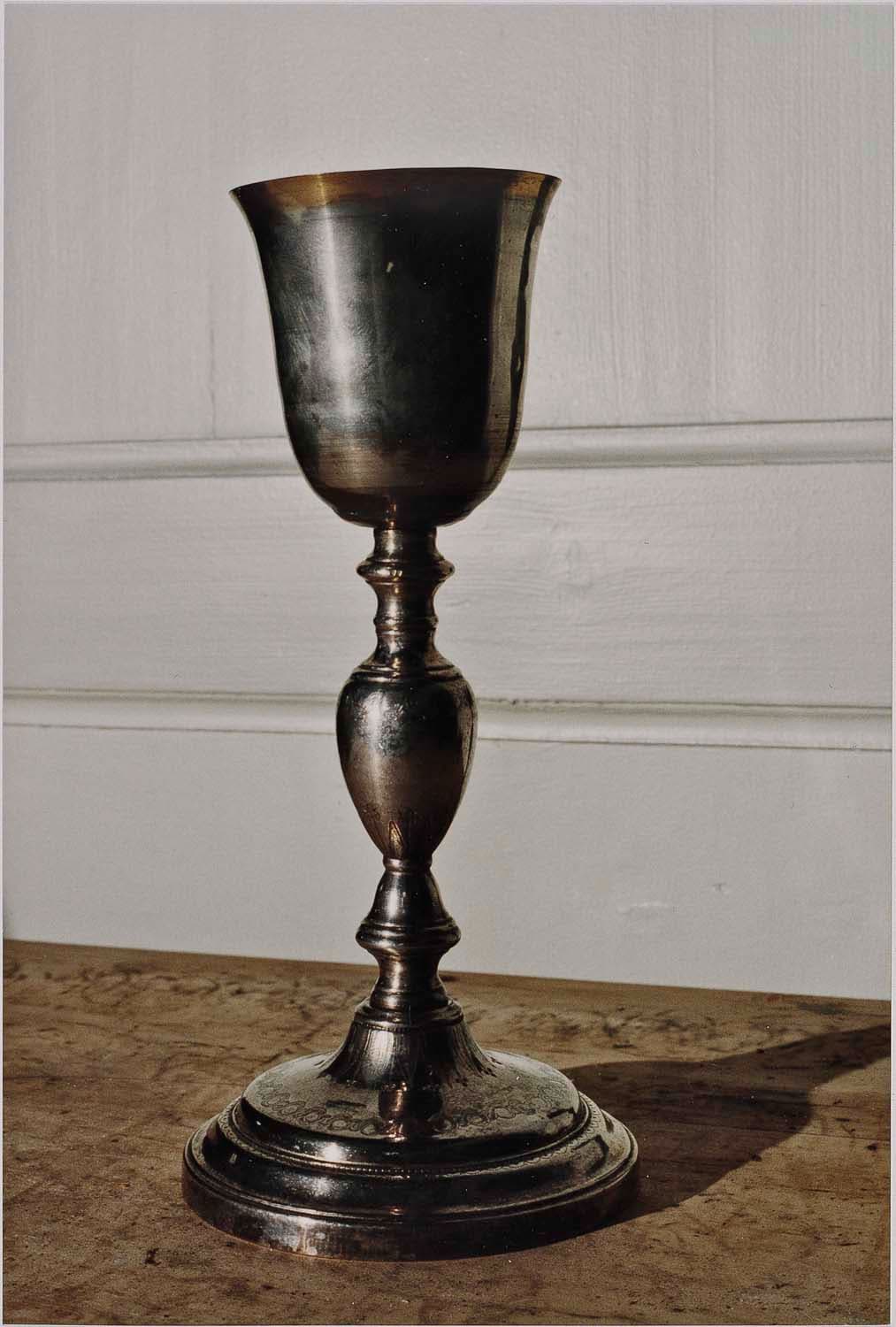 Le décor est estampé. Le pied circulaire est composé d'un galbe concave (après haute bague verticale de base, suivie d'un petit ressaut), sans décor et raccordé par un bref arrondi à un méplat orné d'un feston pointillé. La partie supérieure à départ vertical se raccorde par un bref arrondi à un galbe concave montant vers le fût. Le nud présente un profil ovoïde élancé (entre deux collerettes sans décor). La coupe est unie, sans fausse coupe.