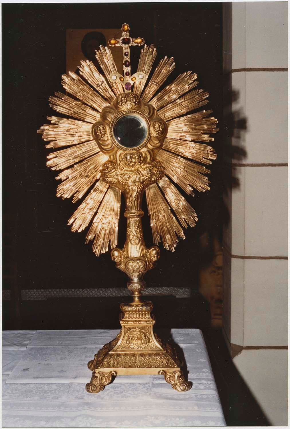 Décor au repoussé et ciselé. La base à étages, sur plan rectangulaire (sur quatre pieds débordants, à involutions et coquille), comporte un plan vertical inférieur surmonté d'un chanfrein contregalbé et orné de feuilles d'acanthe retombantes de profil de part et d'autre d'une mince tige fleurie (formant des motifs dits en cloche accolés). La partie médiane de la base est en tronc pyramidal de galbe concave rejoignant la verticale et dont les quatre faces portent un décor. A la partie supérieure de la base se superposent un boudin orné d'oves (circuaires et en olives, alternées), un bandeau à galbe concave, orné de godrons verticaux déprimés, un chapeau à quatre feuilles d'acanthe d'arêtes, retombantes et encadrant une palmette (au recto et au verso). Le fût est sur plan ovalaire. Il est orné d'un nud de profil piriforme ascendant, outrepassé et composé d'un bulbe inférieur (sur un mince anneau spiralé) à soutien de feuillage, un bulbe supérieur à deux cartouches ovalaires (recto et verso) à encadrement involuté, décors de pampre (recto) et d'une chute d'épis (verso).