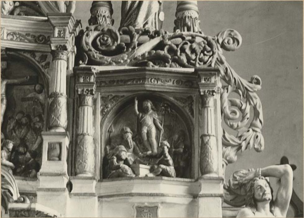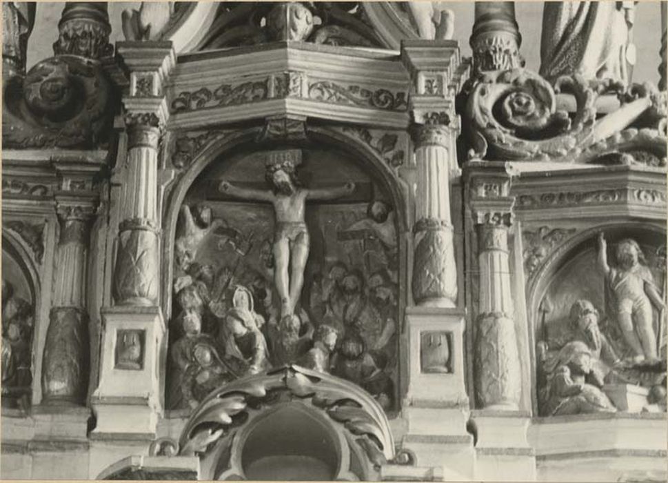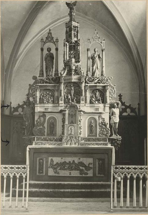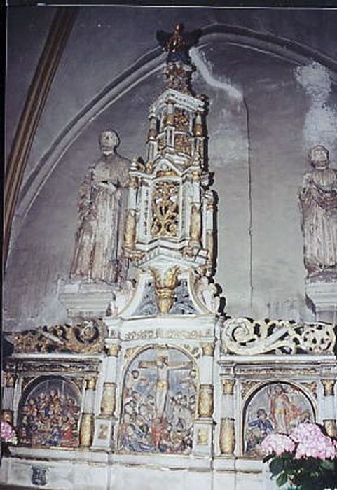 Maître-autel, y compris la marche en pierre avec inscription aujourd'hui sous les fonts baptismaux. Les quatre grandes statues actuellement en place sont modernes. Au 18e siècle, on a exhaussé le retable pour faire un tabernacle à la romaine en ajoutant une partie intermédiaire qui est à supprimer. La table d'autel est cachée par un coffre en bois du 18e siècle, remanié il y a environ trois-quarts de siècle, également à supprimer. La marche supérieure ancienne, qui porte une longue inscription a été déplacée et se trouve actuellement sous les fonts baptismaux. Il y a lieu de lui rendre sa place primitive. L'intérêt tout particulier de cet autel est que le tabernacle est constitué par une tourelle entièrement ajourée, placée tout au sommet du retable, à laquelle on accède par derrière. Ce type d'autel n'a duré que peu de temps au 16e siècle. Celui-ci est de plus daté avec certitude.
