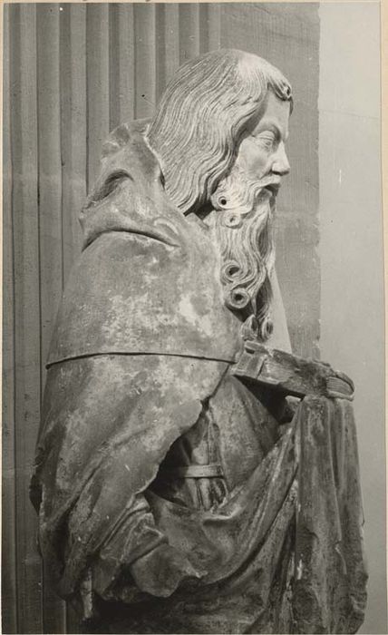 Oeuvre exécutée vers 1400. Un parallèle avec la tête de la statue du vieillard Siméon au grand portail de Reims est assez révélateur.