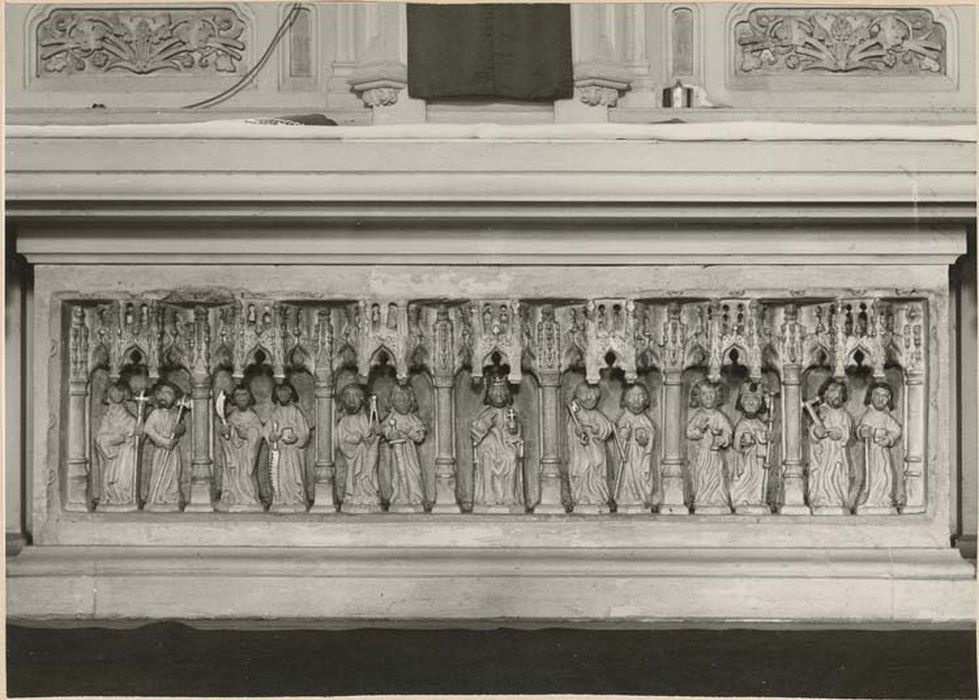 Retable aux douze apôtres, utilisé comme devant d'autel (changement de fonction). Pierre repeinte. Une succession de dais à trois faces découpés d'arcatures trilobées, abrite au centre Dieu le Père tenant le globe du monde, la couronne en tête, faisant le geste de bénédiction, que flanquent les douze apôtres disposés deux à deux et dotés chacun de son attribut habituel. Une colonnette, séparant chaque groupe, porte un court pinacle s'élevant entre les dais.
