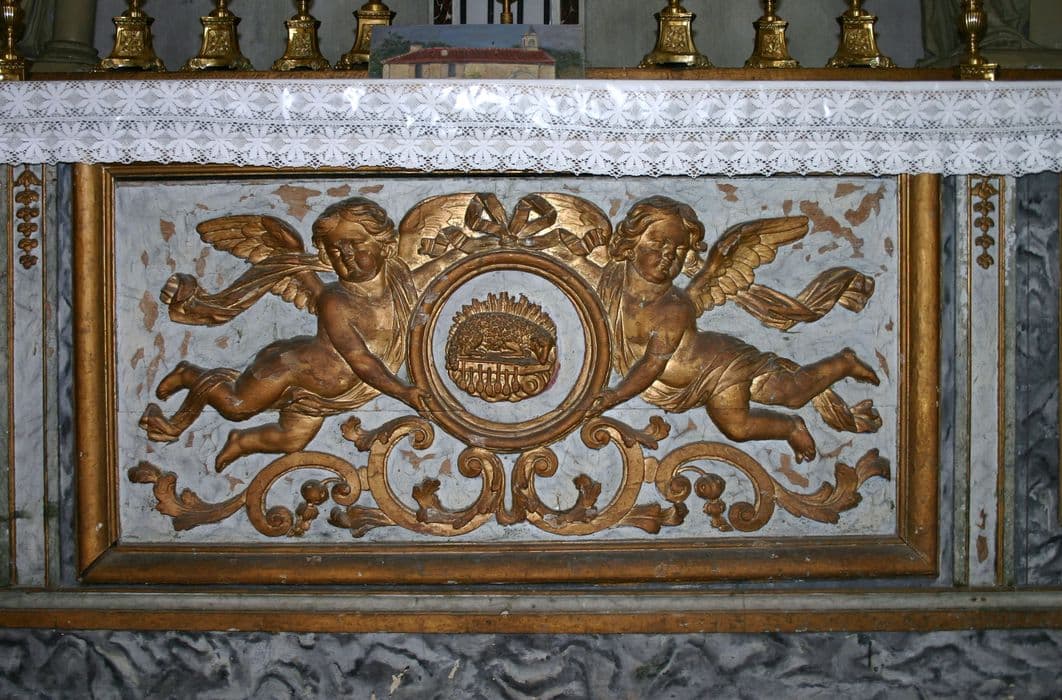 Bois repeint et redoré au bronze. Un panneau, ceinturé d'un forte moulure, offre en bas reliefdeux angelots voletant qui présentent un médaillon circulaire au centre duquel l'agneau symbolique est étendu sur le livre des sept sceaux. A la partie inférieure s'opposent des crossettes ornées de fleurettes et de longues feuilles.