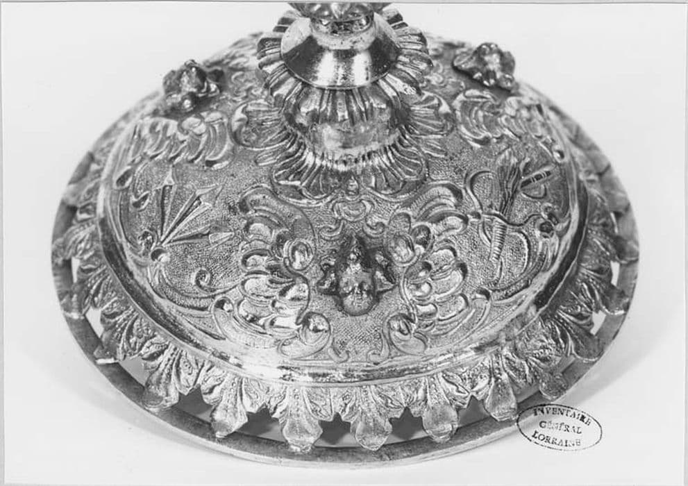 Argent redoré. Par son pied, sa tige au noeud si caractéristique, ce calice présente dispositions, volumes et décor des calices français tels qu'en la plupart d'entre eux à partir du milieu du 17e siècle. On y retrouve en effet, à la base du pied les feuilles d'acanthe ajourées entre elles, le dessus du pied fortement bombé, la tige avec ses tores inférieur et supérieur godronnés et son noeud piriforme. Le décor a toute l'opulence du baroque, notamment avec les têtes d'angelots aux ailes largement développées ; ici, elles sont en plein relief sur le dessus du pied, où elles séparent des trophées d'instruments de la Passion, et sur le noeud. La coupe, bien que ne portant pas de ponçon est très visiblement un apport des débuts du 19e siècle. On retiendra la maladresse de la facture, si évidente avec la ceinture d'acanthe du pied très sommairement modelée, les godrons, et plus encore les têtes d'angelots qui semblent le fruit d'un mauvais surmoulage, et dont aucune ciselure ne vient mettre l'accent sur les détails empâtés lors de la fonte. La tige est aujourd'hui assemblée au pied par une tige en fer à écrou moderne.