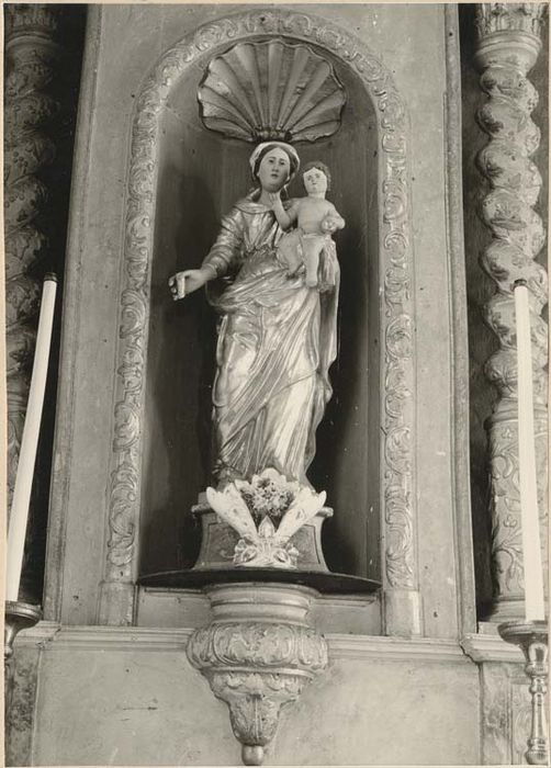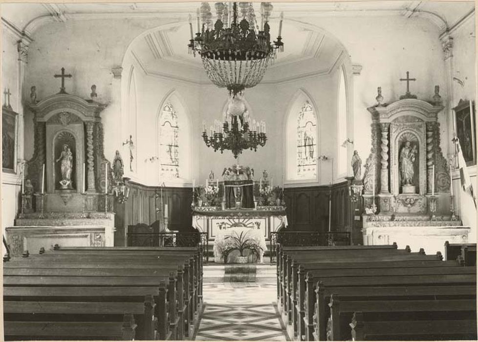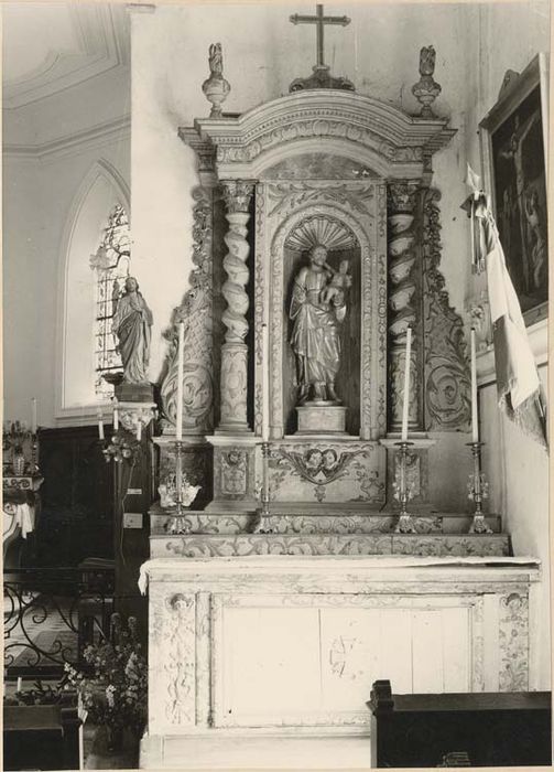 Bois sculpté et repeint. Autel de saint Joseph : il comprend l'autel proprement dit, en arrière duquel un double gradin porte un haut retable abritant la statue du titulaire. Sur la contretable, un panneau de planches grossières, avec en son centre une croix (apport médiocre du début 19e siècle), est encadré d'une large moulure sculptée, les planches tiennent vraissemblablement la place d'un tissu ou d'un panneau peint. De part et d'autre, un panneau vertical l'accompagne où, sous une tête ailée d'angelot, un long cordon double aux multiples noeuds retient une chute d'outils de menuisier, évocation de la profession de saint Joseph. Des rinceaux et des volutes courent sur la frise constituant la face des deux gradins. Du retable on observera l'inhabituel d'une composition qui tend à la dégager de la paroi, la position avancée du corps central où se creuse la niche lui confère une densité que n'atteignent pas la plupart des autels secondaires de la région Lorraine, réduits le plus souvent à n'être, pour leur retable, qu'un placage plus ou moins orné. Sur un soubassement, la haute niche dans laquelle est exposée la statue de saint Joseph s'ouvre dans un avant-corps accompagné de deux colonnes à chapiteaux corinthiens. Droites jusqu'aux deux cinquièmes de leur élévation, torses ensuite, elles supportent un entablement, cintré au-dessus de la niche, que surmontent deux pots à feu et, au centre, une croix. Un aileron plaqué au mur flanque chaque colonne. Sur le panneau central du soubassement, deux têtes ailées d'angelots s'inscrivent dans la courbe de deux longues feuilles opposées limitant une sorte de console prolongeant le sol de la niche. Une même tête d'angelot, des fleurons et des volutes ornent les dés des colonnes, tandis que sous les ailerons ne subsiste que le panneau de gauche couvert d'entrelacs et de volutes. C'est encore une moulure agrémentée de sculpture qui cerne la niche dont le cul-de-four est constitué par une coquille ; des palmes retombent au-dessus de son cintre. Sur la partie droite des colonnes, on retrouve encore les volutes autour d'un médaillon en façon de cuir découpé, sur la partie torse s'enroule une tige aux rameaux feuillus. Un décor de volutes se répète sur la frise de l'entablement. De longues et souples feuilles montent de la partie inférieure des ailerons dont le milieu est quadrillé en losange. Une chute de fleurs et de feuilles retombe de leur sommet. Un socle uni reçoit la statue de saint Joseph figuré debout, portant l'Enfant Jésus assis sur sa main gauche. La main gauche tenait sans doute l'habituelle tige de lys. L'autel de la Vierge : de composition identique à celui de saint Joseph, avec seuls quelques éléments qui diffèrent. Le panneau de la contretable peint en faux-marbre est orné du monogramme AM aux lettres enlacées sur fond de rayons ; ce motif moulé en pâte n'est pas antérieur au début du 19e siècle. Sur les deux étroits panneaux verticaux des extrémités, une coquille surmonte une chute de fleurs. Le panneau central du soubassement du retable est nu, mais s'en dégage un opulent culot sculpté de feuilles d'acanthe, de fleurons et de volutes, prolongeant le sol de la niche. Les colonnes (ici à chapiteaux composites) offrent des spires plus nombreuses. Un décor beaucoup plus dense de tiges de feuillages sur la partie droite, de pampres chargés de grappes sur la partie torse les recouvre. Au-dessus de la niche, un cartouche baroque renferme le monogramme du nom de Jésus IHS, sous le H sont disposés trois longs clous, un dessus une croix. La présence de ce monogramme semblerait signifier que l'autel fut tout d'abord voué au Christ. Le dessin de la partie inférieure des ailerons est d'une élégance moindre que sur l'autel de saint Joseph. Un socle uni reçoit la statue de la Vierge représentée debout, portant l'Enfant assis sur la main gauche.
