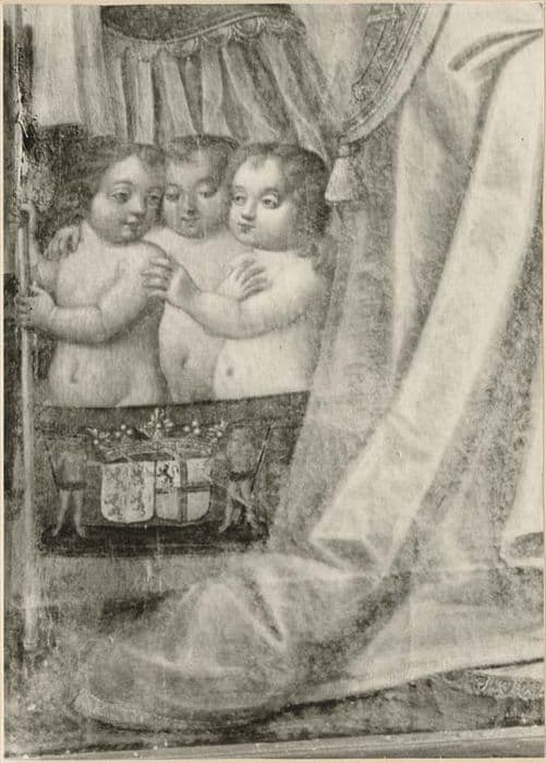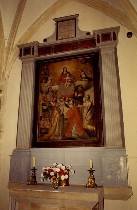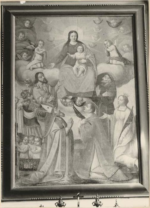 tableau : la Vierge à l'Enfant, entourée de saints et d'armoiries