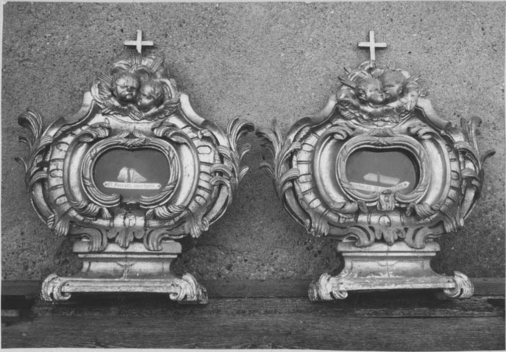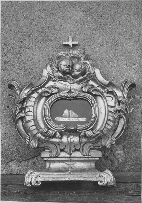 Une base creusée d'une scotie supporte un cartouche rocaille oblong, ouvert en son centre sur l'alvéole destinée à recevoir la relique protégée par un verre ; deux têtes d'angelots ailées, sur fond de nuées, en accusent le sommet.