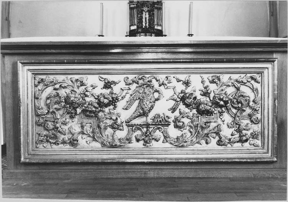 Dorure ancienne mais pas originelle, semble-t-il. Cet opulent panneau encadré d'un large jeu de moulures est la partie essentielle du maître-autel constitué d'éléments hybrides qui furent séparés il y a une dizaine d'années pour composer, d'une part, l'autel face au peuple, d'autre part, avec le tabernacle, la réserve eucharistique. Il comporte en son centre le pélican symbolique exposé sur une moulure godronnée supportée par un cul-de-lampe. De larges volutes opposées bordées de filets le flanquent, de longues feuilles d'acanthes, des fleurs, fleurettes, feuilles et fruits, des épis, disposés avec une belle densité en chute et guirlandes l'étoffent.