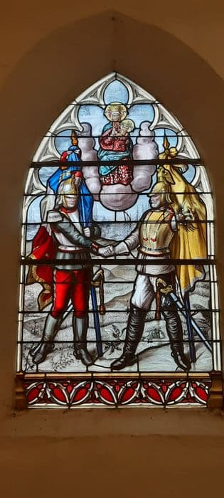 Dans le cadre de l'une des fenêtres en arc brisé de la nef (à l'origine ces fenêtres étaient divisées par un meneau portant un réseau flamboyant), il expose en une composition symétriquement ordonnée, deux officiers l'un en face de l'autre, maintenant chacun contre soi un drapeau et se donnant une poignée de mains sous l'image d'une Vierge à l'Enfant assise, trônant sur une nuée. L'officier de gauche, un lieutenant français, porte l'uniforme de parade des cuirassiers, tel qu'il fut arrêté en 1884. A droite, l'officier russe au visage étoffé d'une courte barbe, appartient vraissemblablement à une arme correspondante ; sa cuirasse, son casque sommé d'un aigle bicéphale, entièrement dorés, magnifient sa prestance et, sans doute, son rang dans l'un des régiment de la garde ? Au drapeau tricolore du Français, répond non pas le drapeau russe, mais le pavillon impérial jaune timbré de l'aigle bicéphale noir sous la couronne des tsars. Armes de l'empire, l'aigle porte en coeur un écu chargé d'un saint Georges équestre terrassant le dragon (emblème de l'ordre de saint Georges créé par Catherine II en 1769), environné d'écus plus petits. La Vierge assise est celle du sanctuaire national de la Pologne, Czestochowa, alors dans la partie de l'empire annexée par la Russie, à la suite des partages de ce pays en 1772, 1793 et 1795.