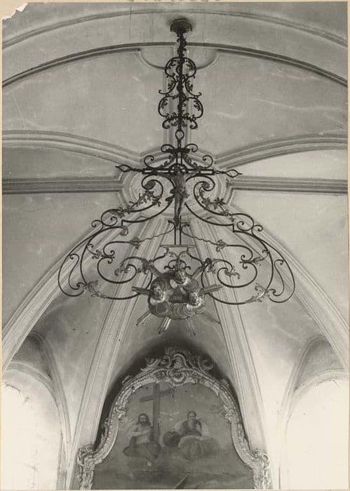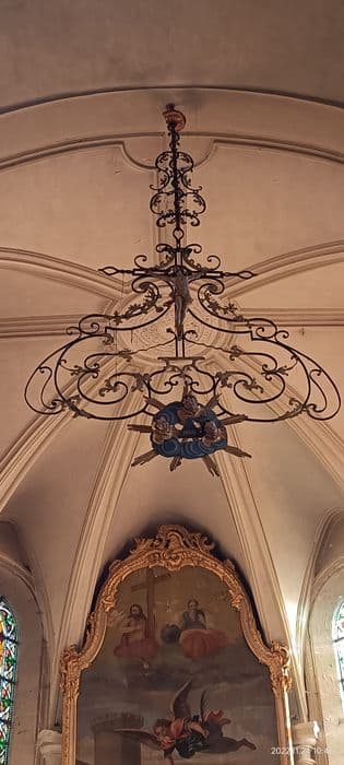 De larges volutes relevées d'un léger décor de tôle martelée, développent leurs courbes sous le croisillon d'une croix exposant un Christ de bois sculpté, la tige qui la suspend à la voûte est également décorée de volutes en fer forgé. A la partie inférieure de l'ensemble, le triangle symbolique portant aujourd'hui la date d'une restauration : 1860, les chiffres étant entourés de têtes d'angelots ailés jaillissant d'un fond de nuages rayonnants, ce relief étant également en bois sculpté.
