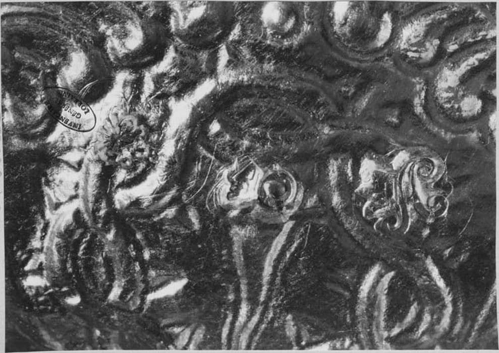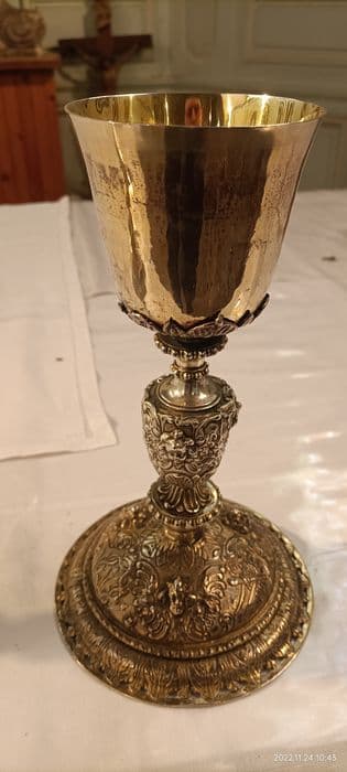 Le pied circulaire comporte à sa partie inférieure un rang de feuilles d'acanthe ajourées entre elles ; son dessus, bombé, est orné entre trois têtes d'angelots ailées en relief d'attributs de la Passion. Il s'élève jusqu'à une moulure godronnée soulignant le départ de la tige coupée d'un fort noeud piriforme également paré des mêmes têtes d'angelots. La coupe est soulignée par un embryon de fausse coupe faite de larges feuilles d'acanthe.