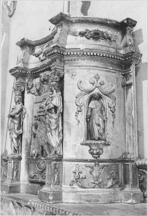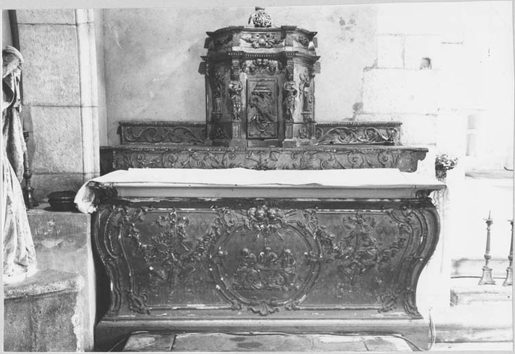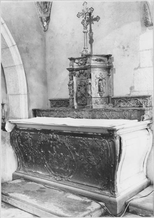 L'autel est en forme de tombeau, galbé sur sa face et sur ses côtés. Sur la table, un gradin supporte le tabernacle qui coupe un second gradin. La face de l'autel est soulignée aux angles par de longues nervures et des courbes opposées. Des trophées d'objets liturgiques retenus par des noeuds de rubans se mêlent à des guirlandes de fleurs et de feuilles de part et d'autre d'un imposant médaillon occupant toute la partie centrale. Il expose en bas reliefla Cène d'Emmaüs que dominent de gracieuses têtes d'angelots ailées au milieu de nuées rayonnantes. Les gradins furent visiblement recoupés. Au centre de celui du bas, un médiocre relief, montrant un ciboire et un calice disposés en sautoir, est une adjonction postérieure. L'un et l'autre gradins sont uniformément couverts de rinceaux courant sous une tablette à bord godronné. La face du tabernacle, concave, avec sa porte où est figuré le pélican symbolique, a sa partie supérieure couverte de têtes d'angelots ailées. Deux beaux anges cariatides la flanquent couronnés chacun d'un chapiteau composite supportant l'entablement qui, sur la face, est réduit à la seule corniche. Les flancs, disposés obliquement, opposent la convexité de leur plan. Sur chacun d'eux une petite niche ouverte au-dessus d'une console abrite à gauche, la statuette de saint Jean-Baptiste, à droite, celle d'une sainte dépourvue d'attribut. En dessous, sur un petit panneau, s'étale une palmette d'où naissent les courbes de deux longues feuilles sommées chacune d'une minuscule croix de Lorraine. Une sorte d'attique profilé en doucine exhausse le tabernacle, il est orné sur la face d'un lourd motif à fleurons et, sur les côtés d'un relief de fleurs et de feuilles. Des feuilles d'acanthe en accusent les angles. Il était vraissemblablement la base d'une exposition plus ou moins élevée. Il devait en outre être flanqué d'ailerons. Dans sa place actuelle, le tombeau a été surélevé par une plinthe.