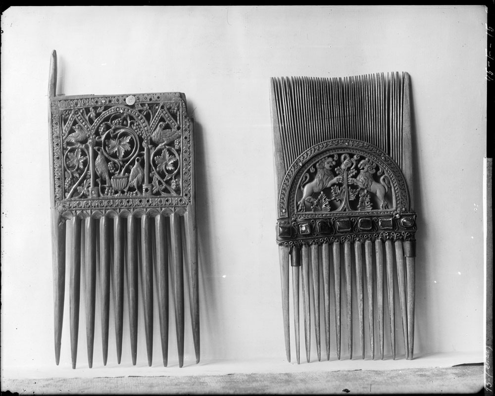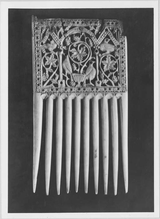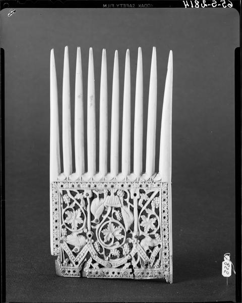 Peigne à dents opposées et dont il ne reste qu'un côté armé de dix grosses dents. Il ne reste plus que la dent latérale de côté opposé. L'intervalle est repercé à jour d'un arc plein cintre entre deux arcs angulaires, portés sur deux colonnettes. Sous l'arc central, un calice d'où sort un ceps où perche un oiseau. Bordures de feuilles formant palmettes. Perles d'émail dans les yeux des oiseaux, dans quelques parties de l'architecture, et dans l'oeil qui sépare les palmettes de la bordure.