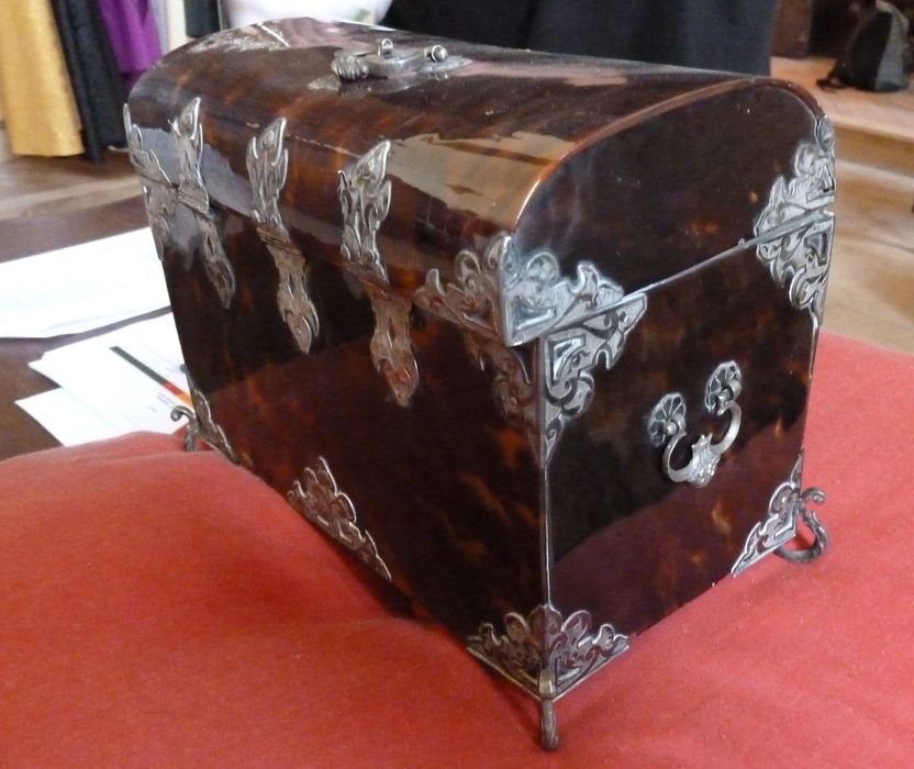 Coffret rectangulaire, à couvercle en demi-cylindre surbaissé, en écaille blonde garnie d'argent. La garniture se compose de trois charnières, douze écoinçons, deux cornières, une serrure à bossage ovale et une poignée en argent découpé et gravé.