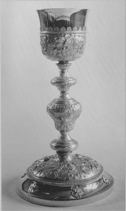 1er calice : anges tenant les instruments de la Passion (sous la coupe) ; Ecce Homo, Flagellation, Portement de croix (pied) ; noeud réparé et très mal redoré.