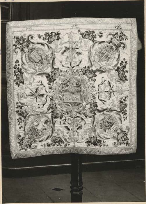 soie (blanche) : brodé ; matériau textile : velours uni ; fil métal : doré, argenté ; soie : polychrome, brodé