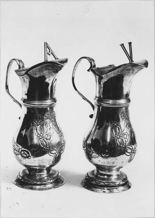 Intérieur doré. Leur pied circulaire conduit par une gorge à un corps en forme de balustre. Il est arrêté par une bague moulurée marquant le départ de la partie profilée pour former le bec verseur que modèle une arête en sa partie médiane. L'orifice se ferme par un couvercle à charnière qui en épouse le profil. L'anse est constituée par une volute se refermant à ses extrémités et fixée d'une part sur le corps balustre, d'autre part à la partie postérieure du bec verseur. Des guirlandes de fleurs gravées et entrecroisées sont le seul ornement du corps.
