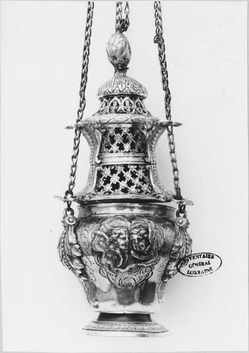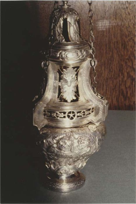 Une base circulaire ornée d'une ceinture de feuilles d'eau disposées en dents de scie supporte la cassolette en forme de balustre court, ses flancs sont divisés en trois parties par des excroissances faites de feuilles d'acanthe en fort relief d'où partent les chaînes ; entre-elles, des têtes d'angelots ailées s'enlèvent sur des fonds de nuages. Le couvercle se compose d'une partie concave assez élevée, ajourée par un réseau constitué de quatre feuilles, coupée horizontalement par une moulure ; elle est divisée en hauteur par trois éléments composites aux travers desquels courent les chaînes. Le couvercel a pour couronnement, au-dessus d'un tore orné, une partie ajourée également concave sous une sorte de calotte modelée de feuilles d'eau à son sommet ; d'un bouton orné part la chaîne servant à le lever. Les chaînes, du type dit à grain de blé, sont réunies à leur extrémité à une sorte de rosace servant à retenir l'encensoir dans la main ; cette rosace en cuivre, semble être le fruit d'une restauration.