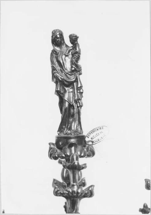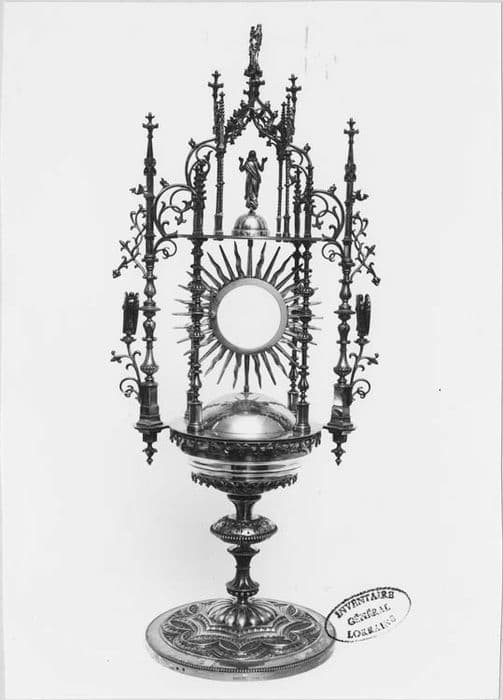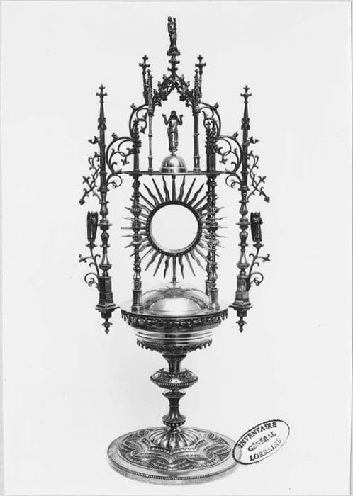 C'est une pauvre, maigre et sèche interprétation de la Monstrance dite de Charles Quint, offerte par cet empereur à la collégiale d'Aix-la-Chapelle à l'occasion de son couronnement en 1520. On y retrouve, depuis le pied jusqu'à la Vierge du sommet, tous les éléments qui la composent (seuls les deux anges des côtés et la Vierge à l'Enfant du sommet ne sont pas dorés).
