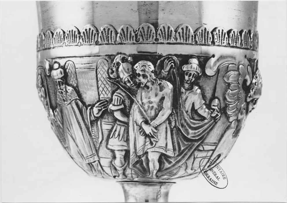 Partie inférieure du pied faite d'un cercle de feuilles d'acanthe ajourées entre elles, tandis que le dessus en est fortement bombé, les différentes parties de la tige avec le noeud animé de têtes d'angelots en relief, la fausse coupe bordée d'un feston de petites feuilles dressées, l'ample coupe enfin au rebord peu évasé. La plinthe qui surélève la base a vraissemblablement été surajoutée tardivement. Il est historié de scènes exécutées au repoussé et finement ciselées. Sur le dessus du pied, on voit la Condamnation de Jésus, la Montée au Calvaire, le Calvaire ; des têtes d'angelots en plein relief avec de longues ailes dressées les séparent. La fausse coupe expose Jésus devant Pilate, puis présenté au peuple (Ecce Homo), entre deux têtes d'angelots aux ailes étalées surmontant des motifs appartenant à la grammaire décorative baroque.