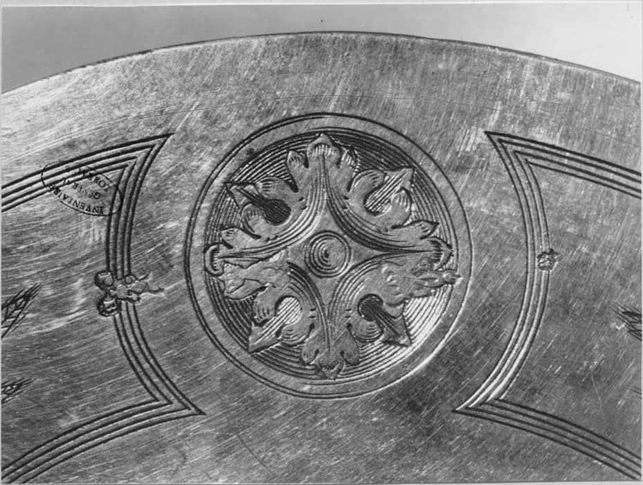 Le dessus du pied, le noeud, la fausse coupe, sont divisés dans les éléments qui constituent leur décor, en six parties, le cavet profilé en quart d'ellipse qui forme la base du pied l'est seulement en trois, avec un motif floral s'inscrivant dans un losange. Sur cette base, un faisceau de baguettes rubannées, profilé en tore, conduit au-dessus bombé du pied, où des entrelacs dessinent des cartouches dans lesquels alternent en légers reliefs de part et d'autre d'une croix, des épis et des grappes de raisins. Un tore couvert de feuilles de lauriers assoit la base de la tige coupée d'un noeud allongé où alternent également épis et grappes. Au-dessus d'un petit tore et d'une gorge, la fausse coupe reprend encore, mais en le développant, le décor d'épis et de grappes, au-dessus de belles et larges feuilles d'acanthes. Tous les éléments du décor finement ciselés, diffèrent dans leurs détails. La patène est ornée en dessous par des motifs gravés, sur la bordure, trois rosaces à décor de feuillage séparent autant de panneaux curvilignes où des épis sont réunis par un ruban. Au centre, une couronne d'épines entoure le monogramme IHS que surmonte une croix, au-dessus d'un coeur et de trois clous.