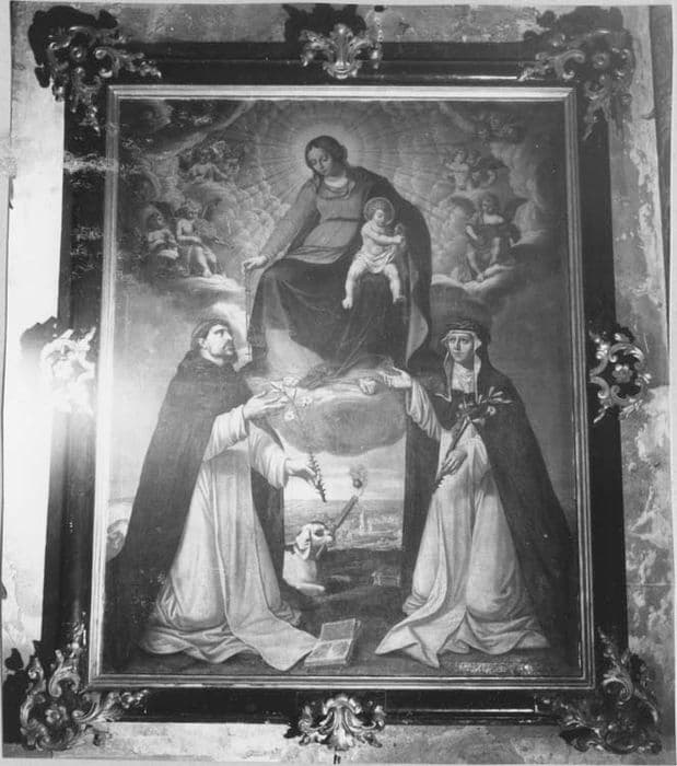tableau, cadre : le Rosaire remis à sainte Catherine-de-Sienne et à saint Dominique