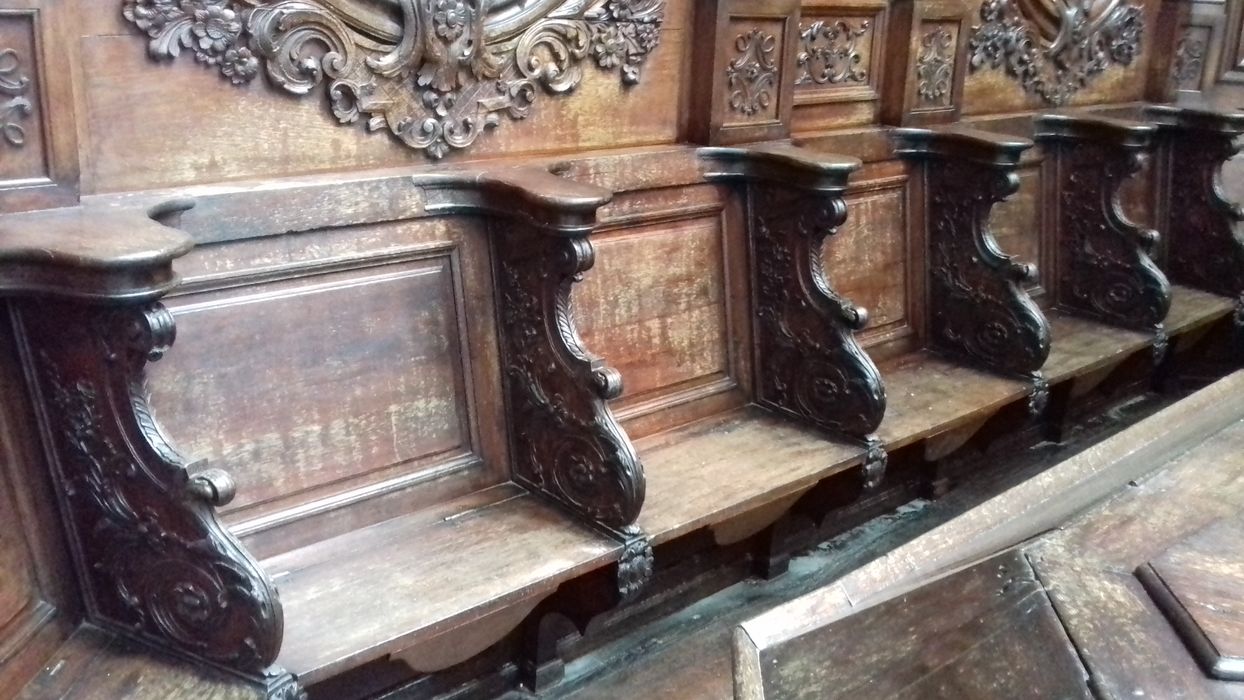 Boiseries et stalles. Ces objets composés de sept grands panneaux ornés de pilastres composites et de deux rangs de stalles constituent un ensemble complet qui paraît bien avoir été conçu pour l'emplacement qu'il occupe actuellement.