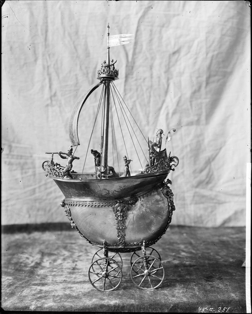 Coquille de nacre, montée sur quatre roues, et bordée par une garniture d'argent gravé, maintenu avec le culot par quatre montants en forme de termes découpés. Au centre, s'élève un mât à hune en forme de couronne fleuronnée, avec haubans, et misaine déployée. A l'arrière, un cardinal est assis, accompagné de deux petits hallebardiers. Au pied du mât, mais sur le côté, un homme en costume du 16e siècle, lui fait face, assis dans une chaise, et tenant un fanion. Du côté opposé, un fluteur et un homme agenouillé coupant une branche. A l'avant, un homme tirant un mousquet.