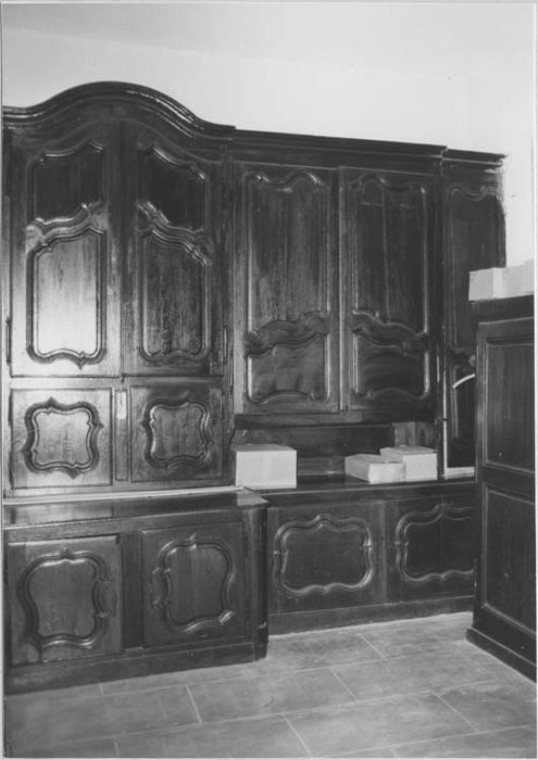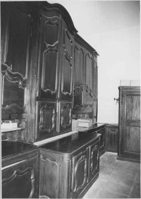 L'ensemble comprend un avant-corps central cintré à son sommet, avec corps du bas formant chasublier en très forte saillie ; deux parties latérales de longueurs inégales avec un vide entre les corps du bas et du haut ; à gauche, une porte d'accès aux sacristies, surmontées d'une imposte pleine ; enfin, à droite, à l'extrémité du corps supérieur, une haute et étroite porte. Toute cette façade est le résultat d'au moins un réaménagement dont témoigne très visiblement le corps inférieur de la partie centrale (chasublier), de même que la partie supérieure de la corniche. Hormis la porte d'accès, tous les panneaux s'ouvrent sur des placards par des portes simples ou doubles. La mouluration, vigoureuse par son profil et son dessin se réfère au style Louis XV. Tout le chêne mis en oeuvre a acquis une belle et chaude patine. Les ferrures sont de fer noirci.