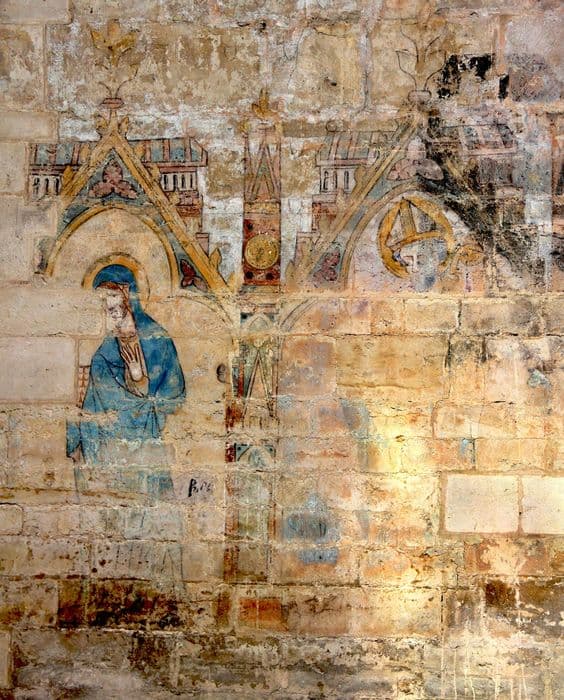 Cette peinture se compose de deux motifs semblables renfermant le premier, une sainte femme, et la seconde, un saint personnage, évêque sans doute. L'entourage représente une arcature ogivale couronnée d'un gable triangulaire avec crochets et fleurons. Derrière le gable, un toit de maison et des fenêtres.
