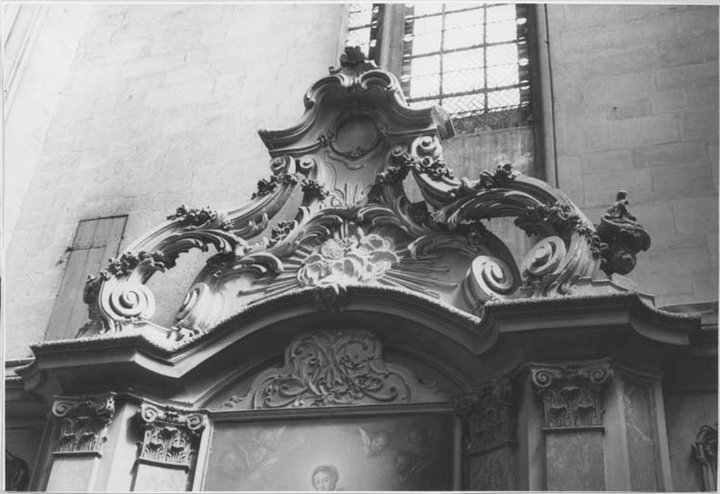 Autel, retable, portes de la sacristie, marbre (gris et rouge veinés), pierre (blanche peinte et dorée) et bois sculpté et peint (en gris). L'autel s'appuie à un ensemble revêtant toute la partie inférieure de la paroi est du bras sud du transept, et comportant un vaste retable à fronton baroque flanqué de deux hautes portes à deux vantaux, surmontées chacune d'une peinture enchassée dans la boiserie. Cet autel est un parallélépipède de marbre animé sur la face et sur les côtés par une forte moulure dessinant des panneaux aux montants chantournés. Il est prolongé latéralement par un soubassement portant, après deux étroits panneaux verticaux concaves et disposés obliquement pour faire saillir le retable sur la paroi, deux pilastres à chapiteaux composites redoublés par deux autres, disposés également sur plan oblique, qui encadrent un tableau surmontant un panneau à bordure rocaille coupé en son centre par un tabernacle adventice. Ce tableau visiblement non fait pour cet emplacement, d'une facture très médiocre, représente l'Immaculée Conception. Il est encadré d'un sèche moulure, mais surmonté d'un opulent fronton découpé, où de grandes lettres entrelacées mêlées de palmes dessinent le monogramme AM. L'entablement comporte une corniche cintrée en son centre sans architrave, ni bandeau. Un somptueux baldaquin baroque couronne l'ensemble. Ses grasses volutes à courbes et contre-courbes opposées, où s'accrochent palmes et guirlandes, supportent l'élément animé du sommet, le tympan qu'elles délimitent est couvert d'une masse de nuages rayonnants. En arrière du départ des volutes, deux vases baroques correspondent aux panneaux verticaux concaves déjà décrits. L'autel et son retable sont précédés d'un emmarchement de pierre sur plan galbé, entouré d'une grille basse à décor d'arcs brisés ; devant l'autel s'étend une marche de bois. Les éléments de boiseries latérales sont visiblement une adjonction postérieure, leur corniche de bois poursuit le profil de celle du retable qui, elle, est en pierre. Leurs portes doubles dissimulent à gauche, la porte gothique aux curieuses ferrures de l'escalier conduisant aux combles, à droite un placard. Les vantaux sont constitués de panneaux chantournés surmontés d'une imposte fixe chargée d'éléments rocailles. Au-dessus, une large bordure chantournée, également enrichie de rocailles encadre, à gauche, une toile montrant la Crucifixion de saint André. La toile de droite montre la Vierge entourée de sept saints et saintes.