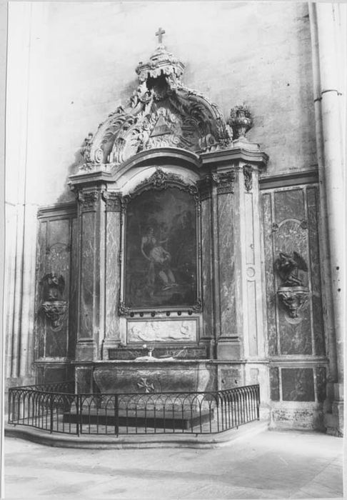 Autel et retable, décor latéral et statues de deux anges adorateurs, marbres veinés (gris et rouge) et pierre sculptée, peinte et dorée. L'autel est adossé à un monumental retable à pilastres composites dont l'entablement porte un fronton où se retrouvent les éléments d'un baldaquin. Un emmarchement de pierre galbé le précède, ceinturé par une grille basse à décor d'arcs brisés. Une marche de bois s'étend devant, limitée à la longueur même de l'autel. L'ensemble, que complètent latéralement un jeu de panneaux, occupe toute la partie inférieure de la paroi est du bras nord du transept. En forme de tombeau, galbé sur toutes ses faces, l'autel dont un forte gorge souligne le rebord de la table, est orné en son centre d'une croix rayonnante de marbre blanc. Il est prolongé latéralement par les dés portant les deux pilastres extérieurs du retable, ils sont dédoublés par deux autres disposés obliquement pour en encadrer la partie centrale dont un bas-relief de marbre blanc (déjà classé) constitue la prédelle. Cette prédelle est surmontée d'un grand tableau à fronton cintré, à bordure rocaille, montrant le Christ au jardin des Oliviers (déjà classé). Précisons que le gradin placé devant la prédelle semble être une adjonction du 19e siècle. La corniche courant au sommet de l'ensemble, cintrée en sa partie centrale, supporte un fronton où des nuées rayonnantes exaltent le triangle de la Trinité. Les volutes d'un baldaquin, en arrière desquelles deux vases laissent échapper des chutes de fleurs mêlées de palmes et de guirlandes, l'encadrent et supportent un couronnement d'où retombe un lambrequin. Latéralement, d'étroits panneaux verticaux concaves disposés obliquement éloignent le retable de la paroi qui, entre celui-ci et les faisceaux de colonnettes supportant les nervures des voûtes est recouverte d'un assemblage de panneaux de marbre. En leur centre, de part et d'autre du retable, une importante console, constituée d'éléments d'une rocaille assagie et de guirlandes, porte un ange adorateur agenouillé ailes déployées. Ces deux anges, de très bonne facture, offrent des attitudes différentes extrèmement gracieuses et animées.