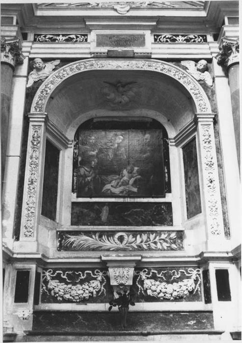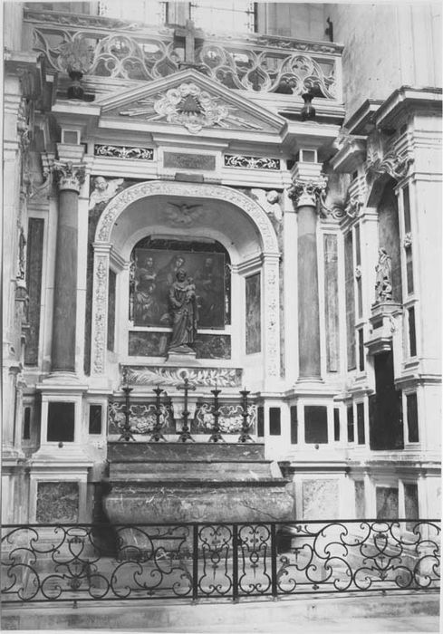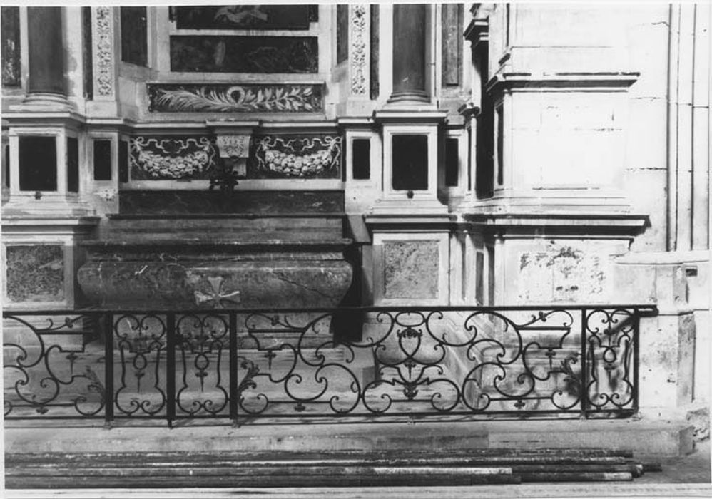Ensemble de la chapelle Saint-Joseph, grille. Pierre blanche, marbres noirs et de couleurs, plâtre peint, fer forgé. L'autel de marbre rouge veiné de gris en forme de tombeau fortement galbé est inséré dans le décor de pierre blanche et de marbre noir qui en constitue le retable ; décor qui s'étend aux parois de la chapelle qui l'abrite et dont une grille basse limite la surface. Un soubassement assez élevé porte les dés de deux colonnes à chapiteaux corinthiens formant avant-corps et réunies par leur entablement ; le fronton triangulaire qui les surmonte n'est que le fruit d'une mauvaise restauration du siècle dernier. Occupant toute la surface entre ces colonnes, une large niche assez profonde, aux côtés et au plafond établis obliquement, est également entourée d'une large bordure sculpté de fleurs et de fruits. Destinée à la présentation d'un reliquaire (un buste d'argent de saint Joseph réalisé en 1680 et disparu lors de la Révolution), elle est aujourd'hui occupée par un tableau (voir le dossier le concernant). Sa partie inférieure régnant avec les dés des colonnes est remplie de part et d'autre d'une console par deux opulentes guirlandes. Le revêtement de chacune des parois latérales continue celui des parties inférieures du retable et se pare de deux pilastres doriques moins élevés que les colonnes, ayant leur propre entablement ; ils encadrent une sorte de niche sans profondeur dont le sommet se clôt en trapèze. L'une de ces niches aurait abrité le buste de Philippe Legras, Major de Toul, aux dépens duquel fut élevé cet ensemble. Une inscription restituée en 1886 en rapelle la mémoire, de même que ses armes également restituées sur l'entablement de gauche. Grille : la grille est composée par rapport à son axe de deux éléments longs disposés chacun entre deux étroits panneaux verticaux. Deux de ces panneaux se trouvent donc accolés au centre, constituant une porte de peu de largeur. Un jeu de volutes contrariées rehaussées de quelques discrets motifs végétaux et de fleurons, anime avec élégance les éléments longs, en une composition qui témoigne de l'habileté des ferronniers du milieu 18e siècle. Les panneaux verticaux sont d'un dessin moins heureux.