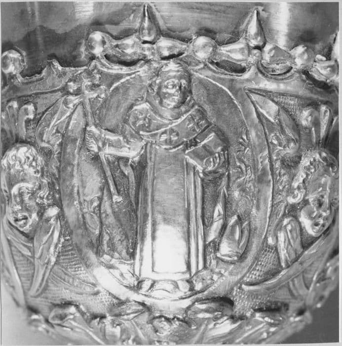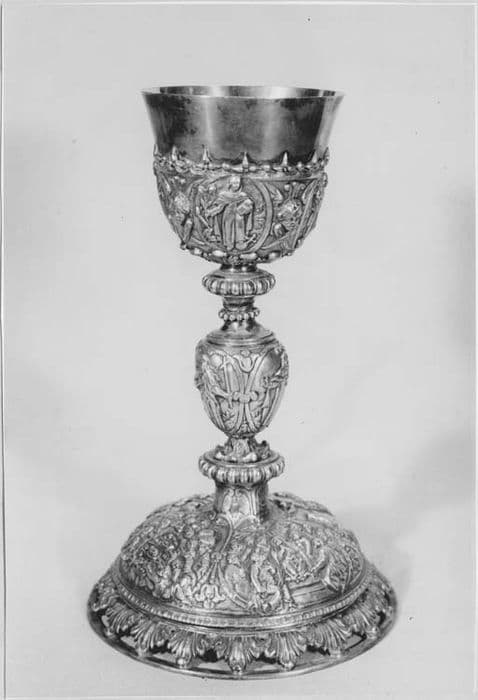 Un rang de feuilles d'acanthe profilées selon une doucine, ajourées entre elles, repose par l'extrémité de ses feuilles sur un cercle formant l'assise du pied. Au-dessus d'une ceinture d'ove quatre bas-reliefs, que séparent de minces volutes naissant de fleurons renversés, en couvrent la partie supérieure, fortement bombée, et se relevant pour former la base de la tige décorée de courtes volutes, dont le départ réél est accusé par un tore godronné ; quatre feuilles d'acanthe, étalées, supportent alors un fort noeud ovoïde où d'autres volutes dessinent trois médaillons ovales occupés par des figures de saintes. Une large gorge, coupée d'un rang de perles, conduit à un second tore godronné, relié par une scotie aux larges feuilles d'acanthe formant le dessous de la fausse coupe, dont la surface est occupée entre quatre têtes d'angelots ailées, en demi-relief, par quatre médaillons ovales offrant autant de figures de saints. Un feston où alternent avec des perles sphériques, d'autres perles piriformes disposées en tréfles, en cerne l'ouverture où s'enchasse la coupe, nue et de forme tronconique. Iconographie : sur le pied, la Crucifixion, la Nativité, la Cène et la Descente du Saint-Esprit ; sur le noeud, la Madeleine, sainte Catherine-de-Sienne, une sainte Dominicaine ; sur la fausse coupe, saint Dominique, saint Pierre-de-Vérone, saint Hyacinthe et un saint Dominicain. Technique : le pied et la coupe sont réunis par deux larges pas de vis. Le décor est fondu et les fonds obtenus à l'outil. Le pied est recouvert d'une mince feuille d'argent maintenue par des rivets. Le feston de la fausse coupe semble avoir été estampé, puis soudé. Patène : la face est sans décor. Au centre du revers, un bas-relief figure l'Assomption de la Vierge. Des têtes d'angelots occupent toute la partie supérieure. Sur la bordure, une couronne d'épines gravée entrelace ses rameaux entourant instruments, symboles et attributs de la Passion. Technique : feuille d'argent sur laquelle a été soudé le bas-relief au revers, lui-même obtenu par la fonte.